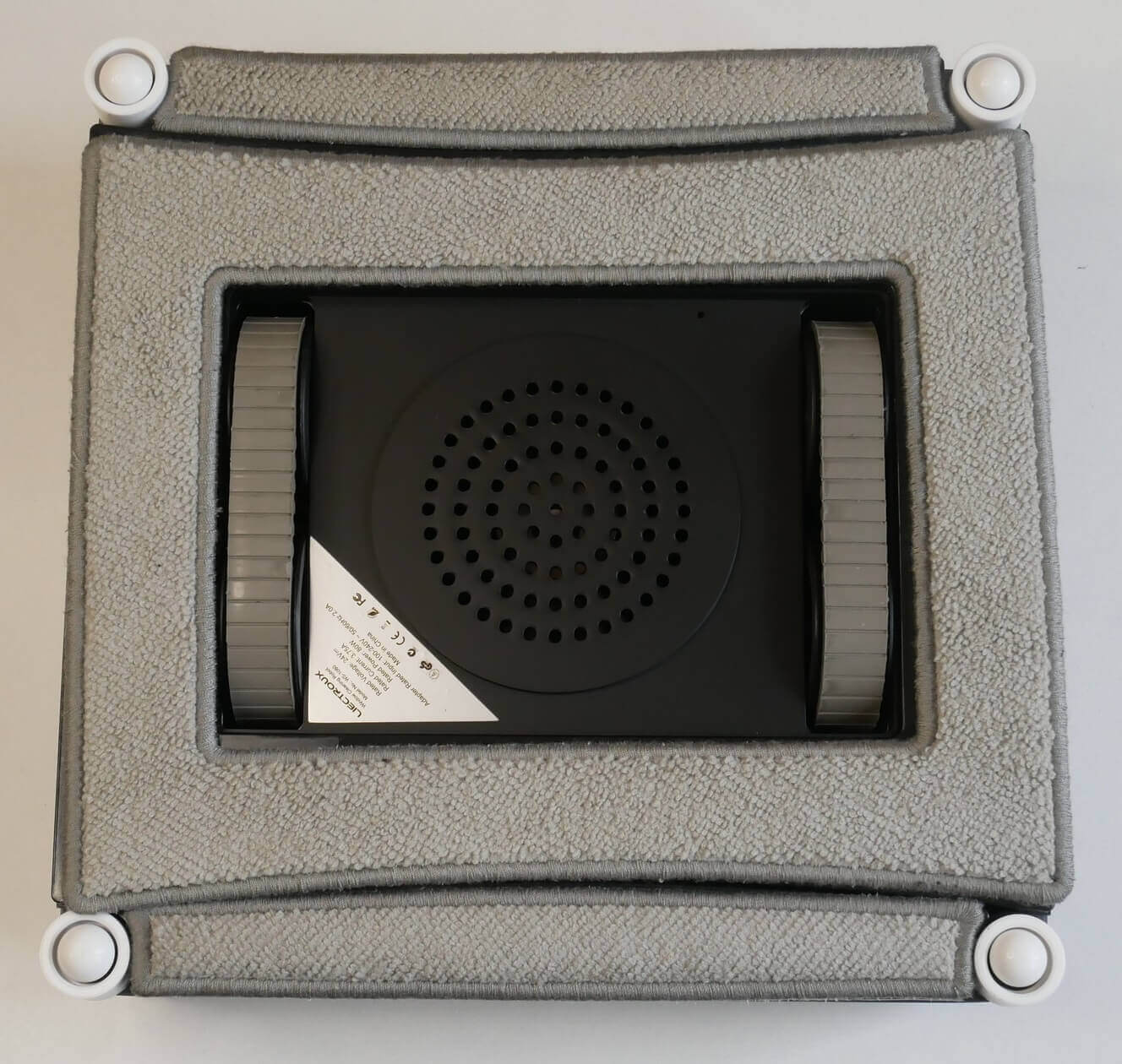 Pažvelkime į „Liectroux WS-1080“ apačią. Matome, kad valymo modulis yra padalintas į tris dalis: stačiakampę centrinę dalį ir du siaurus įdėklus. Šios konstrukcijos paskirtis nėra iki galo aiški.