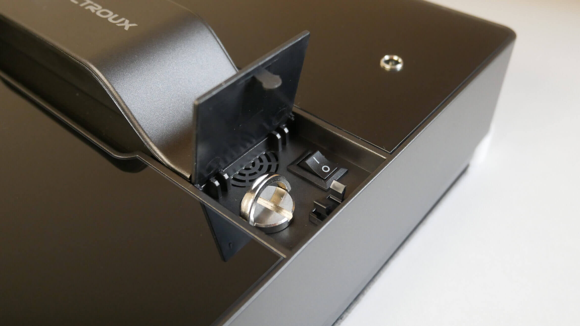 Dešinėje rankenos pusėje yra roboto maitinimo jungtis. Po rankena tvarkingai paslėptas saugos kabelio tvirtinimo taškas ir maitinimo mygtukas. Norėdami atidaryti šį skyrių, tiesiog švelniai paspauskite dangtelį.