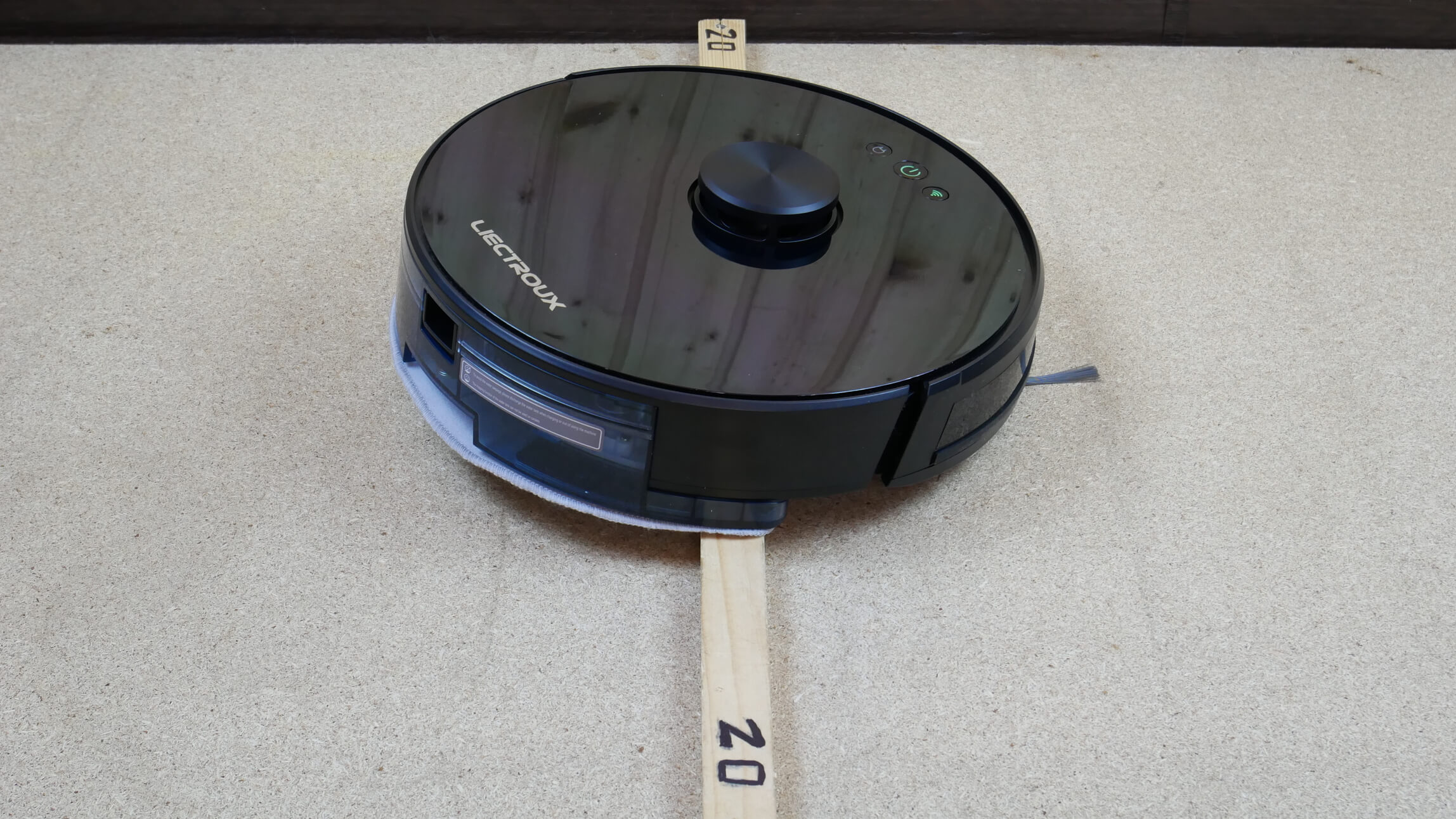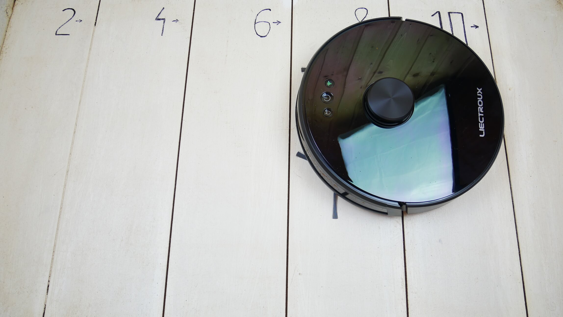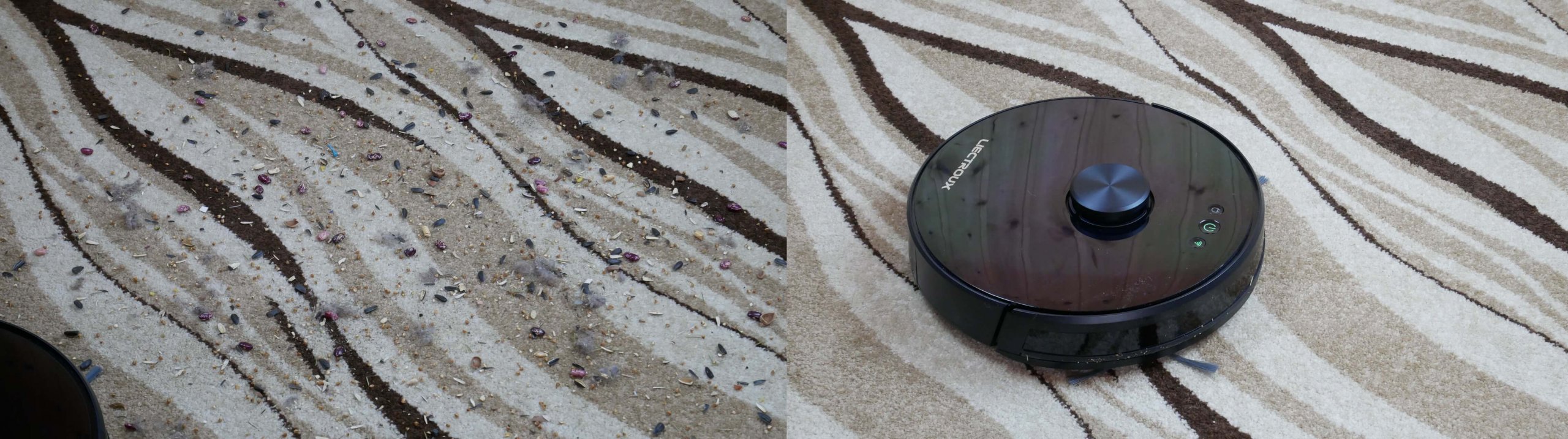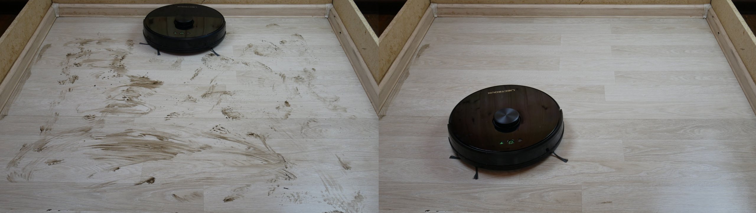 O šiek tiek pridžiūvusių nešvarumų valymo efektyvumas ant grindų yra geresnis nei vidutinis. Liko neišvalyta tik viena siaura juostelė palei grindjuostę, o tai yra akloji zona visiems mano apžvelgtiems robotams dulkių siurbliams.