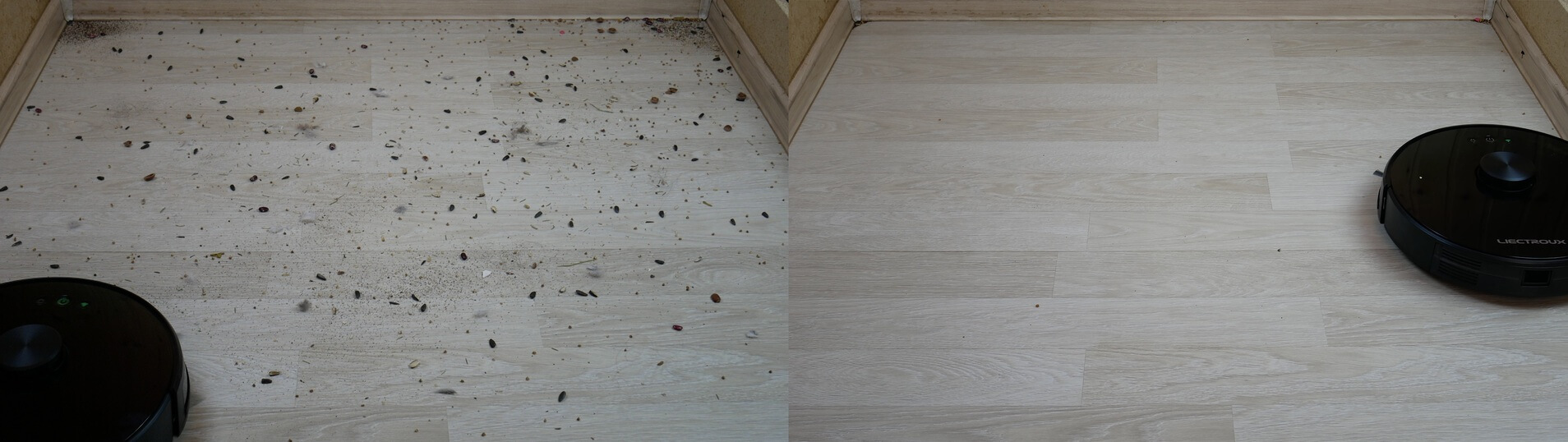 Laminuotų grindų šiukšlių surinkimo kokybė buvo aukštesnė nei vidutinė, net ir lyginant su įvairiais tipais. Robotas veikė gerai ir netgi iš kampuų iššlavė šiukšles geriau nei daugelis kitų apvalių robotinių dulkių siurblių. Tačiau jis nebuvo tobulas. Plaukai susipainiojo šepečiuose, bet didžioji dalis šiukšlių liko dulkių konteineryje. Išlaikė šį testą!