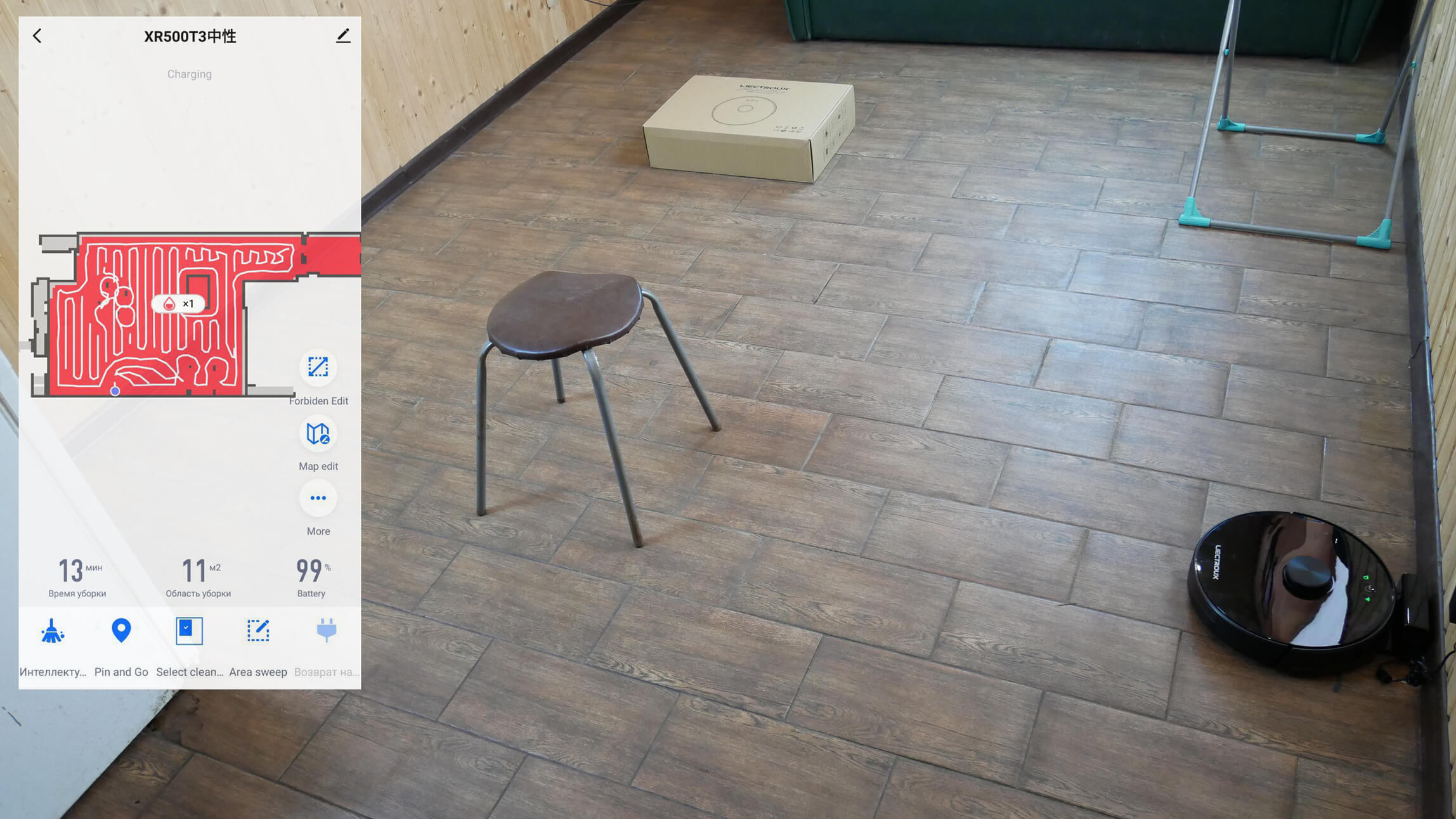 Galiausiai pereikime prie bandymų. Pirmiausia patikrinsime „Liectroux XR500“ navigaciją kambaryje su kliūtimis. Robotas dulkių siurblys pirmiausia pervažiuoja visą prieinamą plotą palei perimetrą, tada persijungia į vingiuotą judėjimo modelį. Jis neužstringa ant džiovyklės kojų, atskirai apibraukia dėžę ir kėdės kojas, o tada automatiškai grįžo į pagrindą. Bandymas sėkmingas!