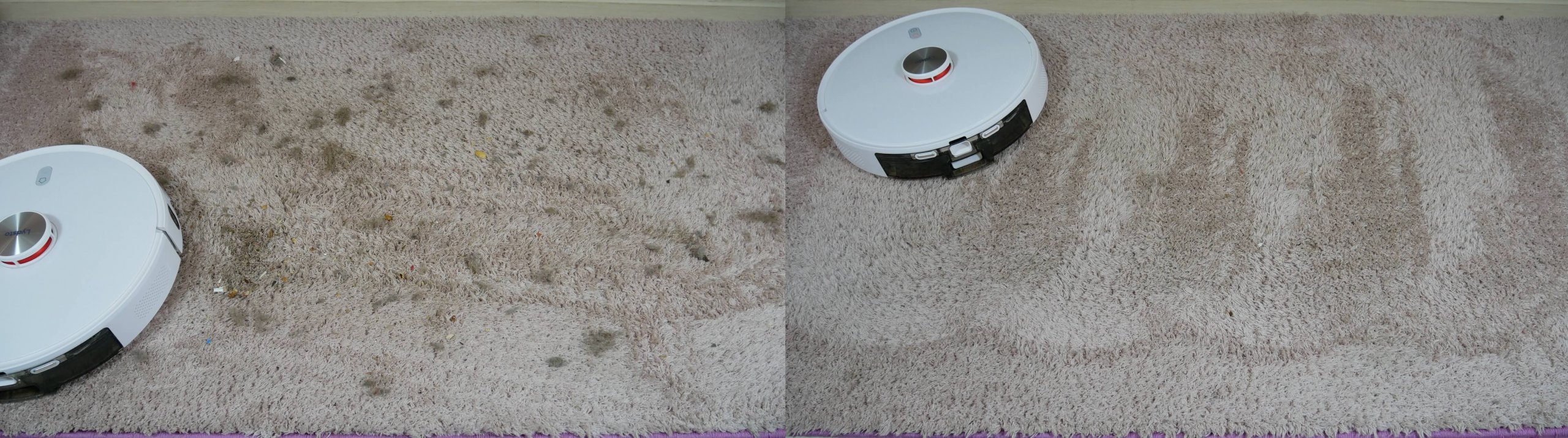 Tačiau valant kilimus šlapiu būdu, objektų aptikimo sistema sugedo. Mano atveju kilimas buvo vidutinio plauko, apie 3 cm aukščio. Robotas dulkių siurblys tiesiog jo neužlipo, nes objektų aptikimo sistema jį atpažino kaip kliūtį. Nėra jokio būdo išjungti lazerinių jutiklių ant buferio, kaip tai įmanoma su panašiais įrenginiais. Dreame Bot L10 Pro arba „Ecovacs Deebot OZMO N8 PRO“ dulkių siurblysAtitinkamai, jei ant grindų yra 2 cm ar aukštesni kilimai, robotas į juos tiesiog neįlips. Tačiau jei rankiniu būdu perkelsite robotą ant kilimo, jis jį išvalys, kaip ir viename iš ankstesnių bandymų.