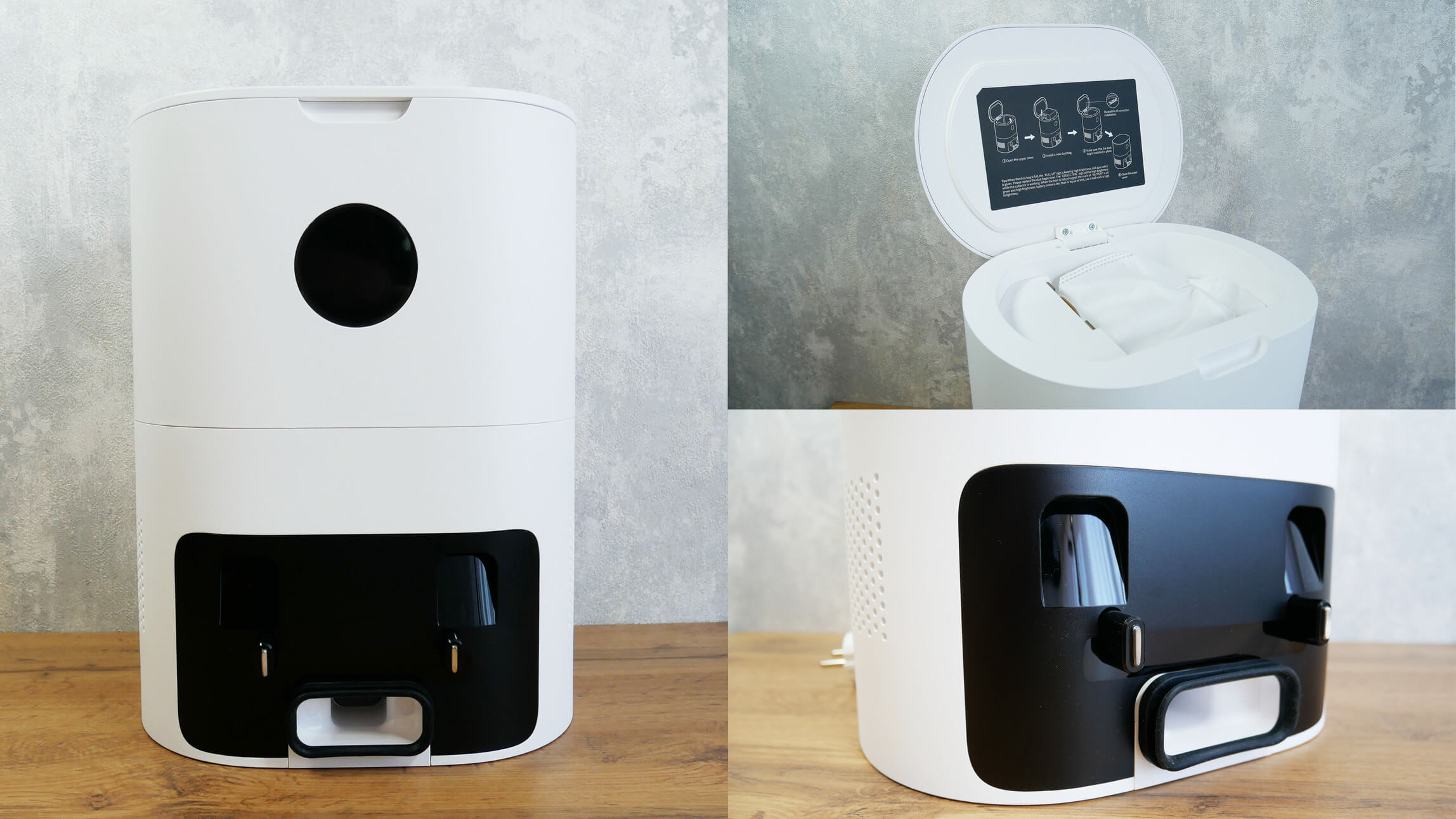 Savaime išsivalanti stotis lieka nepakitusi. Po dangteliu yra maišas, kuriame telpa iki 3 litrų sausų atliekų. Žemiau yra ekranas, kuriame rodoma roboto būsena ir akumuliatoriaus įkrovos procentas. Po juo yra įkrovimo gnybtai ir siurbimo kanalas, per kurį atliekos iš konteinerio ištuštinamos į maišą stotelėje.