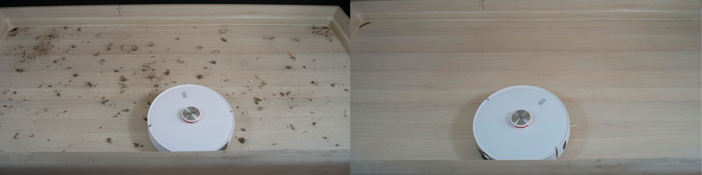 Laminuotų grindų cheminis valymas yra geras. Robotas dulkių siurblys sugebėjo surinkti nuo grindų daugumą šiukšlių, įskaitant ne tik smulkias buitines šiukšles, bet ir naminių gyvūnėlių plaukus bei plaukus. Tik šiek tiek šiukšlių liko kampuose, kur beveik visi rinkoje esantys apvalūs robotai nesugeba efektyviai išvalyti. Centrinis ir šoniniai šepečiai sugavo šiek tiek naminių gyvūnėlių plaukų ir plaukų. Bandymas sėkmingas!