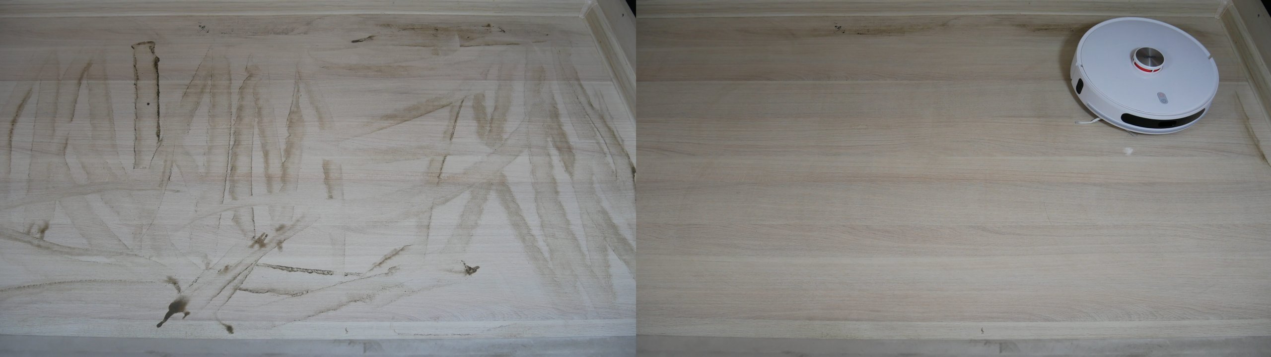 Dėl šlapio valymo taip pat nusiskundimų nėra. Laminato valymo kokybė neprilygsta panašiems gaminiams. Ant grindjuostės liko tik viena dryželė, tačiau tai visų iki šiol apžvelgtų robotinių dulkių siurblių silpnoji vieta.