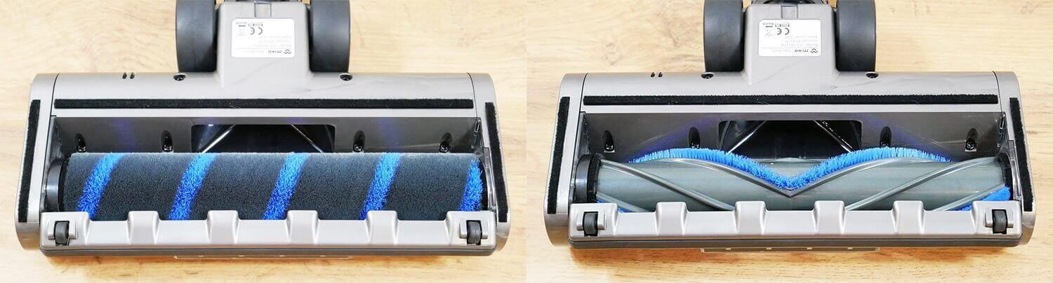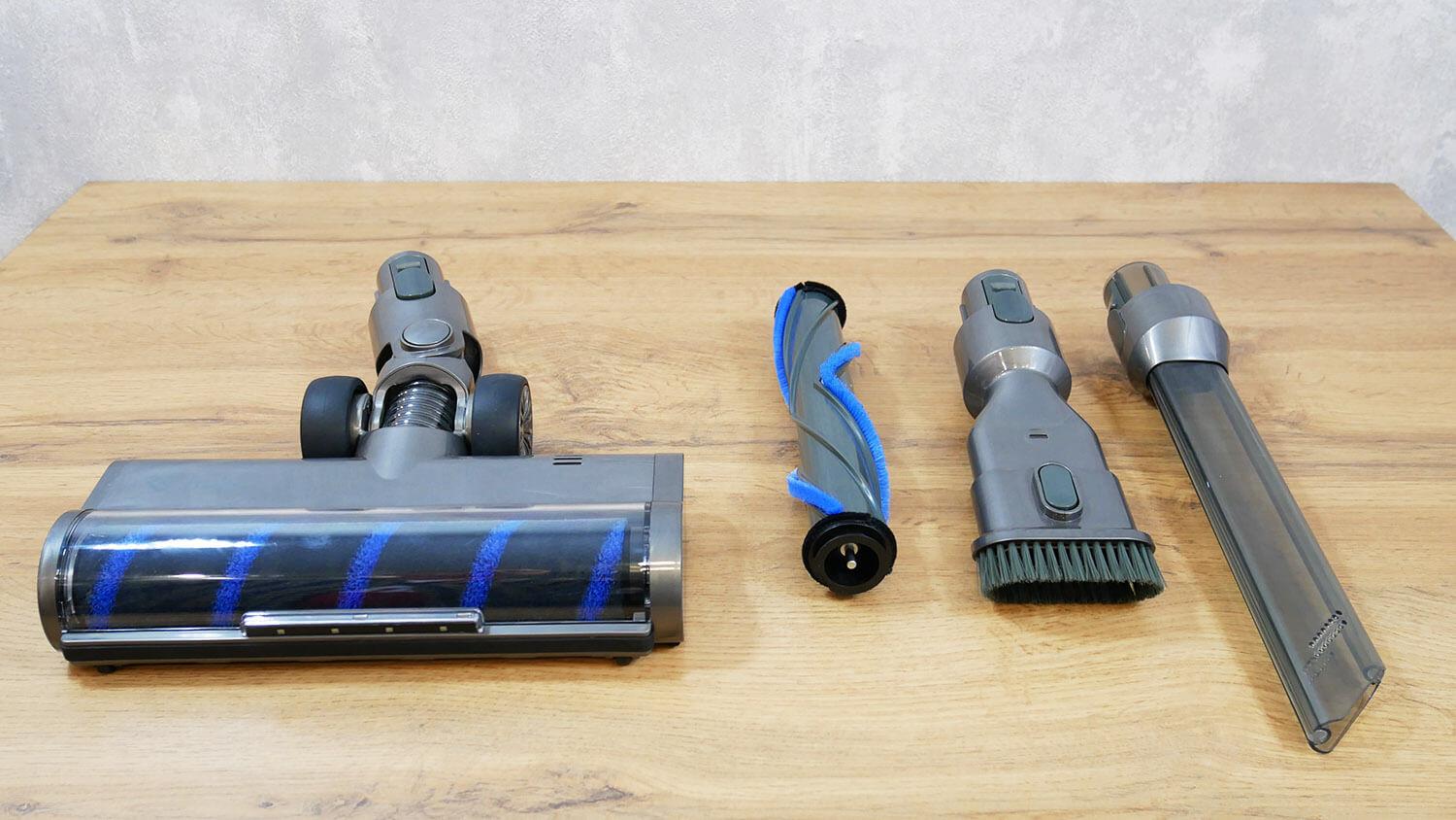 Pažvelkime į pridedamus priedus. Pagrindinis grindų antgalis turi lemputę, kuri apšviečia valymo zoną. Tai yra privalumas. Prie jo pridedamas universalus volelis kilimams ir kietoms grindims. Fiksavimo mechanizmas lengvai nuimamas iš šono, todėl nereikia papildomų įrankių. Vietoj šio volelio galite įmontuoti purų volelį su minkštais šereliais. Jis švelnesnis kilimams, ir daugelis renkasi šį dizainą.