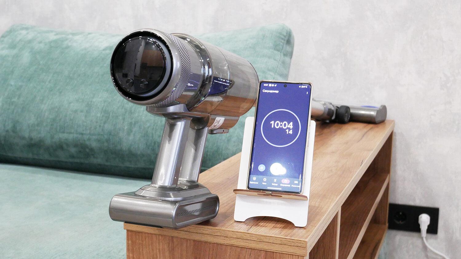 Galiausiai pereikime prie bandymų. Pirmiausia patikrinkime „Miko V12“ baterijos veikimo laiką turbo režimu su prijungtu pagrindiniu grindų antgaliu. Jis veikė 10 minučių ir 4 sekundes – tai gana standartinis rezultatas. Verta paminėti, kad dulkių siurblys gali veikti iki 55 minučių minimaliu galingumu ir iki 20 minučių vidutiniu galingumu.
