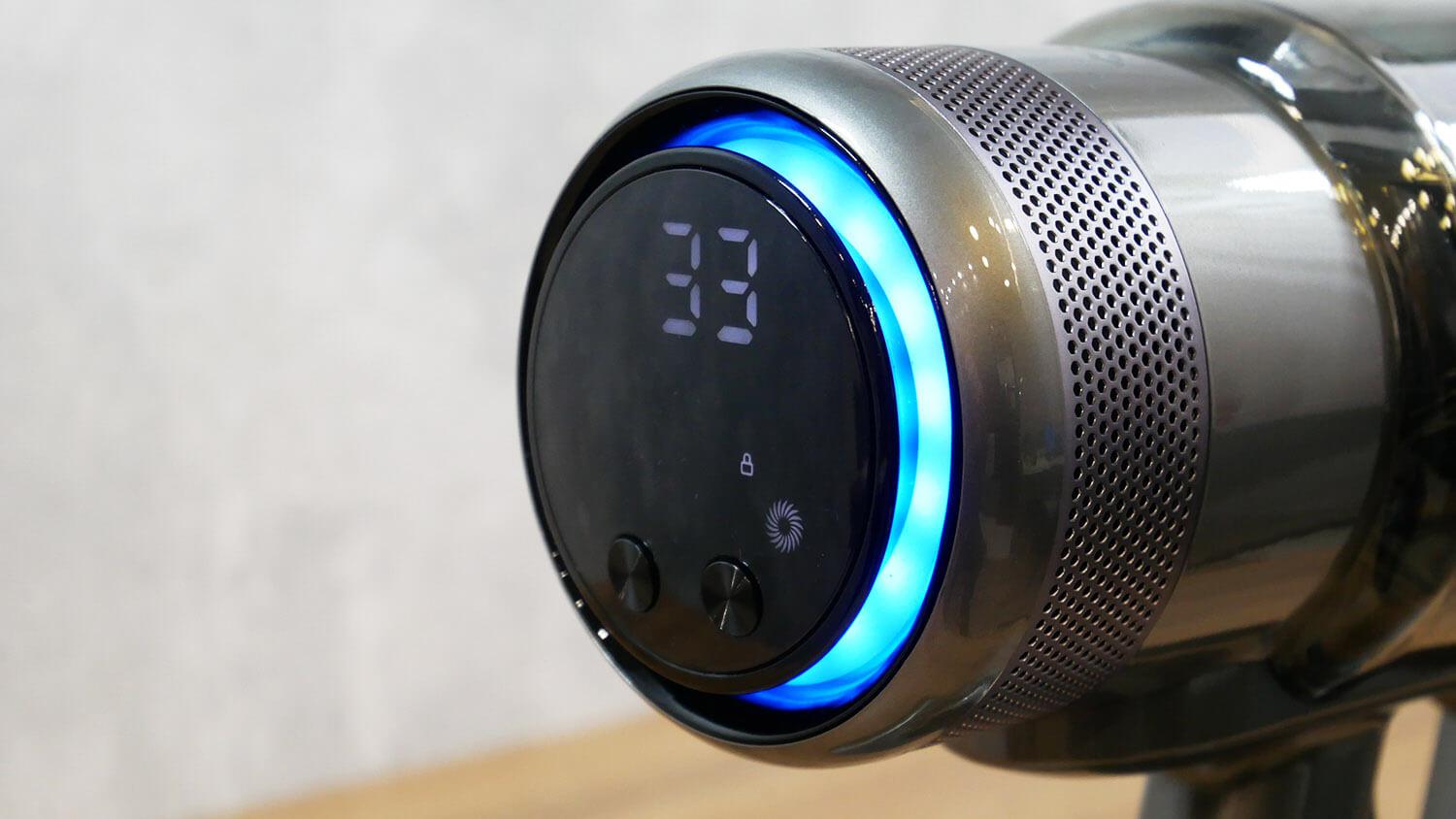 Dulkių siurblys įjungiamas ir išjungiamas paspaudus paleidimo mygtuką. Dulkių siurblio gale yra informatyvus ekranas su dviem mechaniniais valdymo mygtukais: vienas skirtas perjungti darbo režimus, o kitas – užrakinti dulkių siurblį, kai jis įjungtas.
