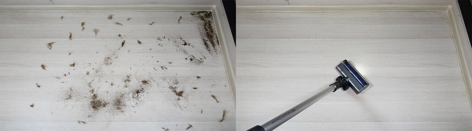 Dabar patikrinkime, kaip gerai „Miko V12“ surenka grindų šiukšles. Ant laminuotų grindų išbarsčiau įvairių rūšių šiukšles: plaukus, kailį, grūdus ir kitas smulkias buitines šiukšles. Ši mašina gerai susidorojo su šia užduotimi. Svarbu pažymėti, kad ji be vargo surenka šiukšles palei grindjuostes ir kampuose. Ji kruopščiai surenka viską. Volelis vos surenka plaukus ar kailį. Visos šiukšlės surenkamos į dulkių konteinerį. Testas išlaikytas!