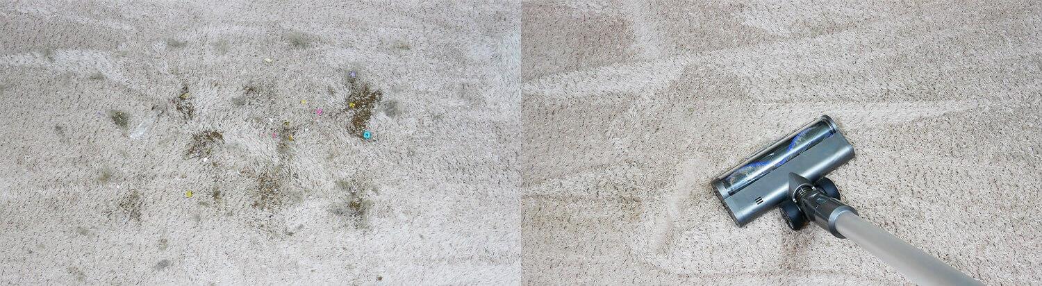 Tos pačios šiukšlės buvo išbarstytos ant kilimo, ir „Miko V12“ atliko tokį pat gerą darbą, kruopščiai jį išvalydamas. Šį kartą buvo naudojamas kilimų valymo volelis.
