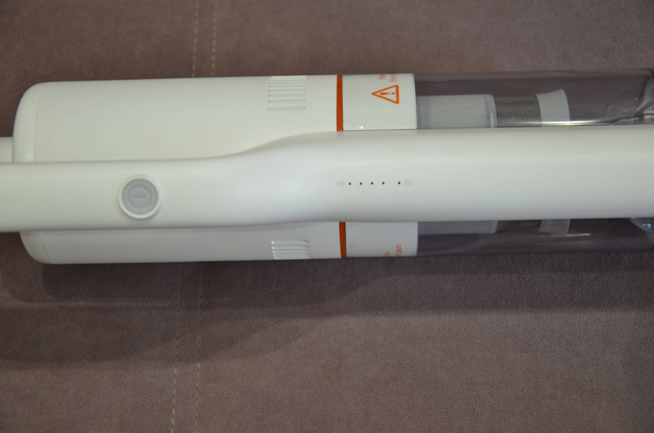 Dulkių surinktuvo pilnumo indikatorius ir akumuliatoriaus lygio indikatorius yra viršuje. Maitinimo mygtukas patogiai išdėstytas rankenos viršuje. Dukart spustelėjus įjungiamas „Turbo“ režimas. Režimo perjungimo mygtukas taip pat yra žemiau rankenos, jei dulkių siurblį laikote kita rankena. Dėl to šį dulkių siurblį lengva naudoti.