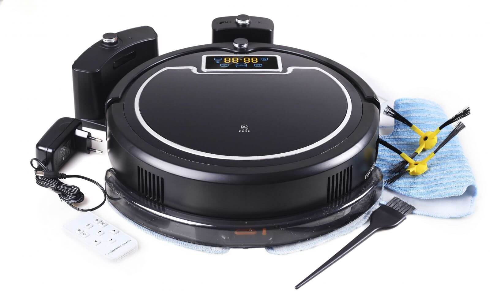 Žemiau esančioje nuotraukoje parodyti „Panda X900 Wet Clean“ robotinio dulkių siurblio komponentai: