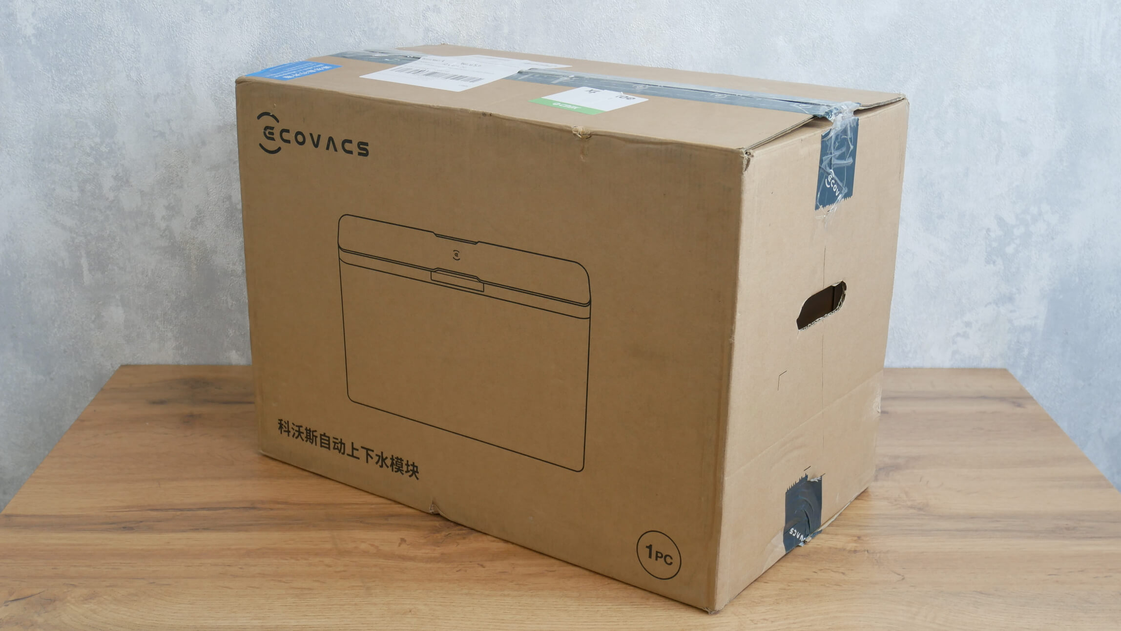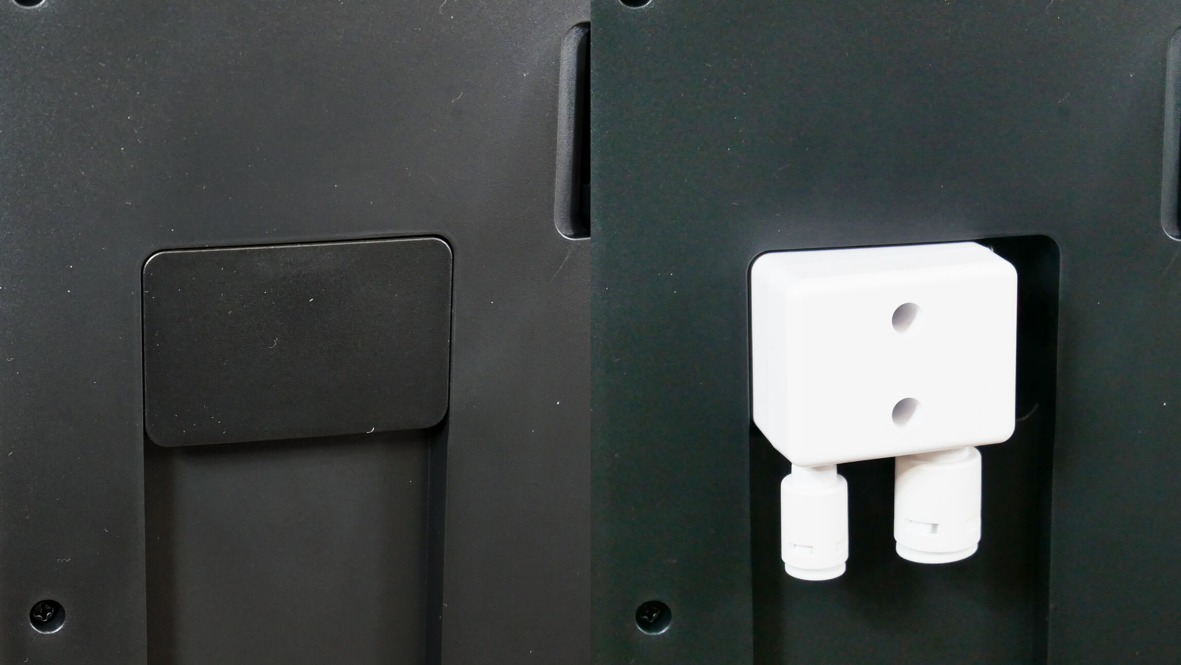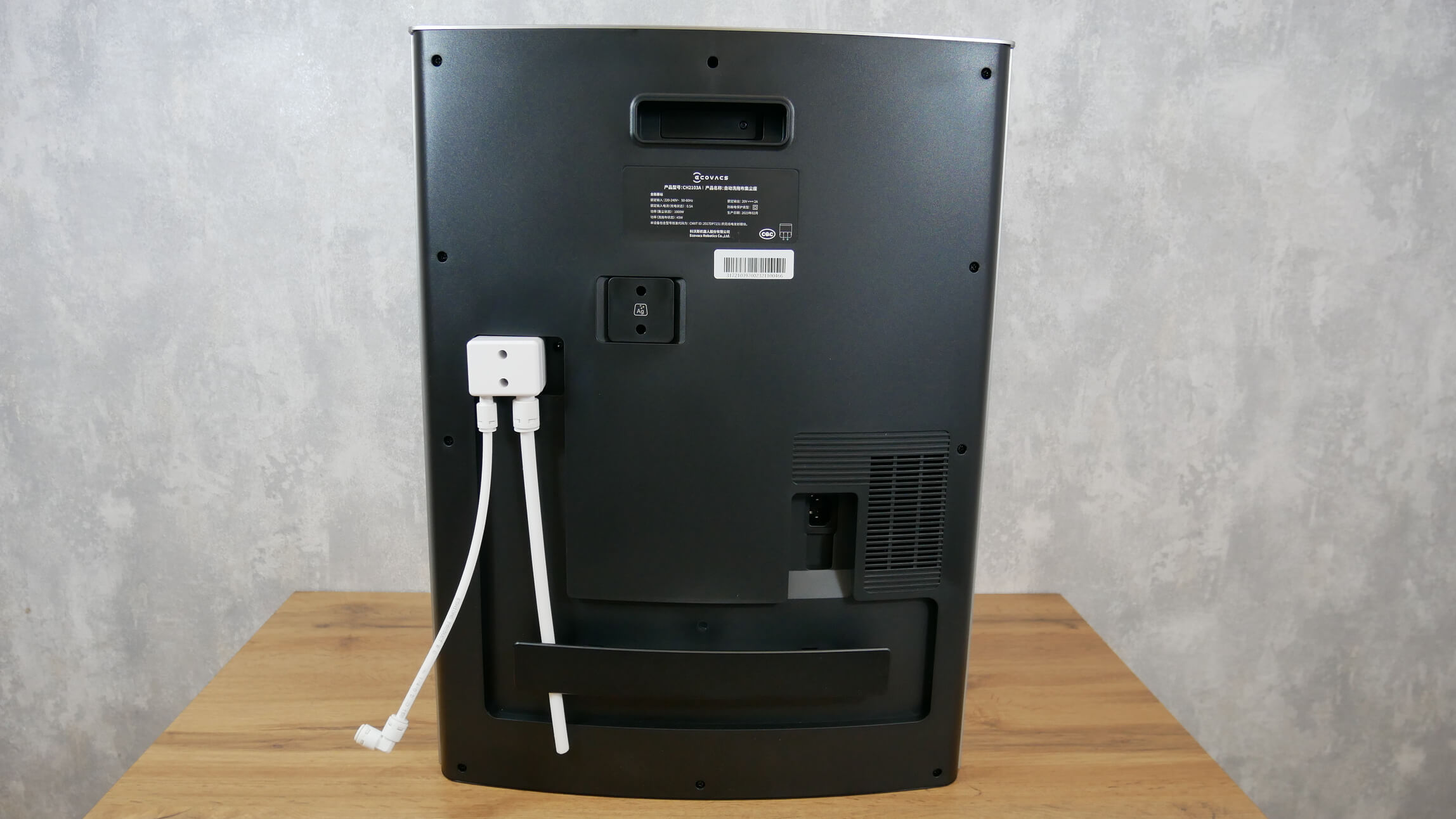Pereikime prie paties prijungimo proceso. Svarbu atkreipti dėmesį, kad ne visos „X1 Omni“ stotys yra suderinamos su šiuo moduliu. Pavyzdžiui, mano apžvelgta versija buvo suderinama. Suderinamumą nustatyti labai paprasta. Jei stotelės gale yra dangtelis, kuris paslepia angas, skirtas prijungti ją prie vandens tiekimo ir kanalizacijos sistemos, ji suderinama. Jei dangtelio nėra, deja, stotelės prijungti nepavyks. Jei svarstote įsigyti „Ecovacs Deebot X1 Omni“, šios apžvalgos pabaigoje įtraukiau nuorodą į pardavėją Rusijoje, kuris parduoda roboto versiją, suderinamą su naudingumo moduliu.