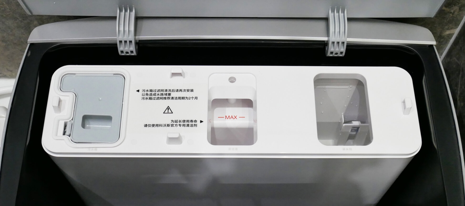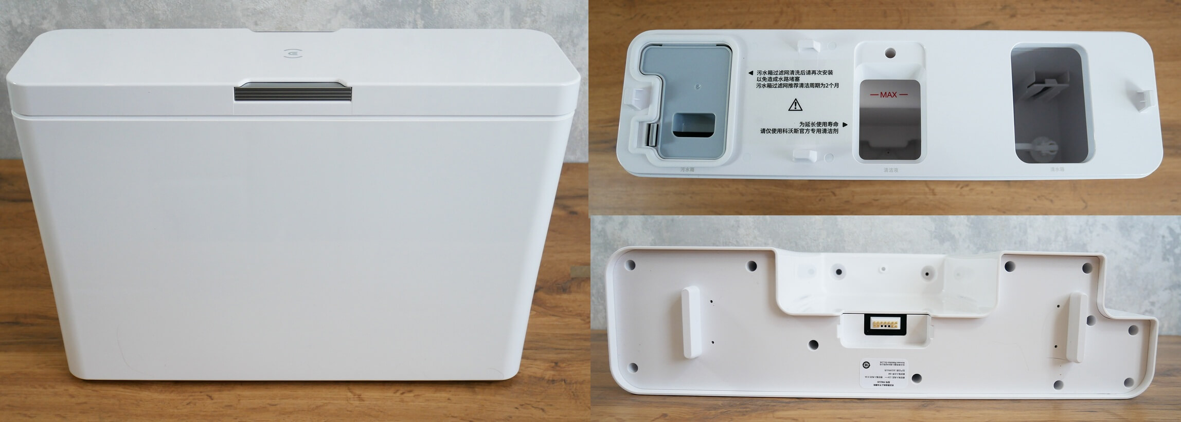 Leiskite trumpai paaiškinti, iš ko susideda pats modulis. Tai trijų skyrių talpykla: viena skirta švariam vandeniui, kita – nešvariam vandeniui (su šiurkščiu filtru) ir trečia – skalbikliui, kuris automatiškai sumaišomas su švariu vandeniu reikiamu santykiu, skalaujant servetėles ir pildant talpyklą roboto viduje. Dizainas yra standartinis, kaip ir panašių įrenginių.