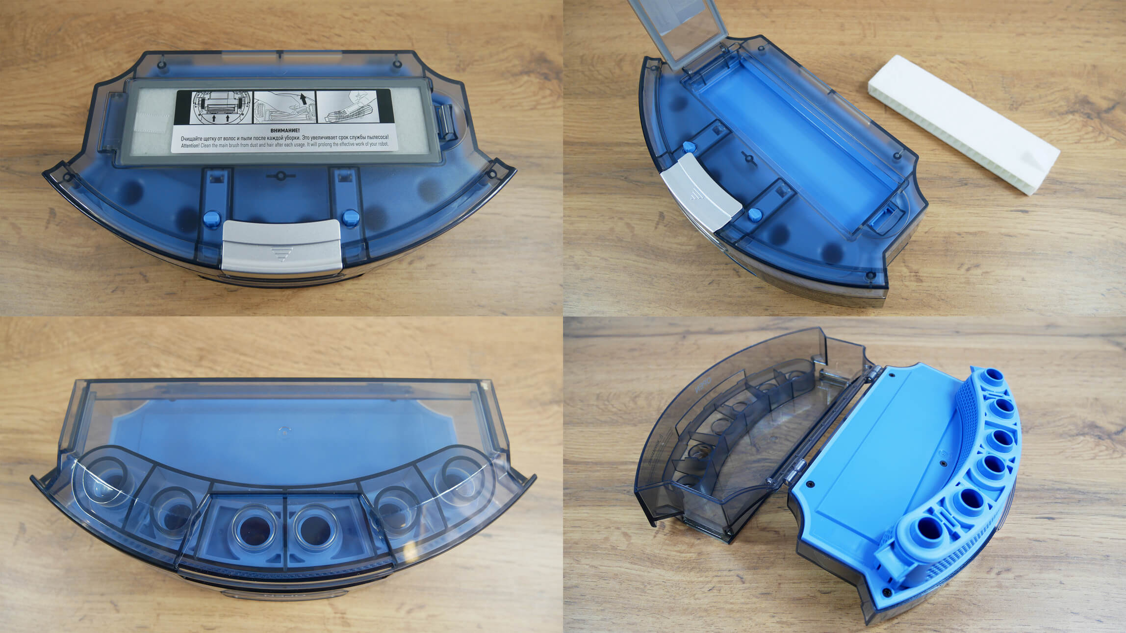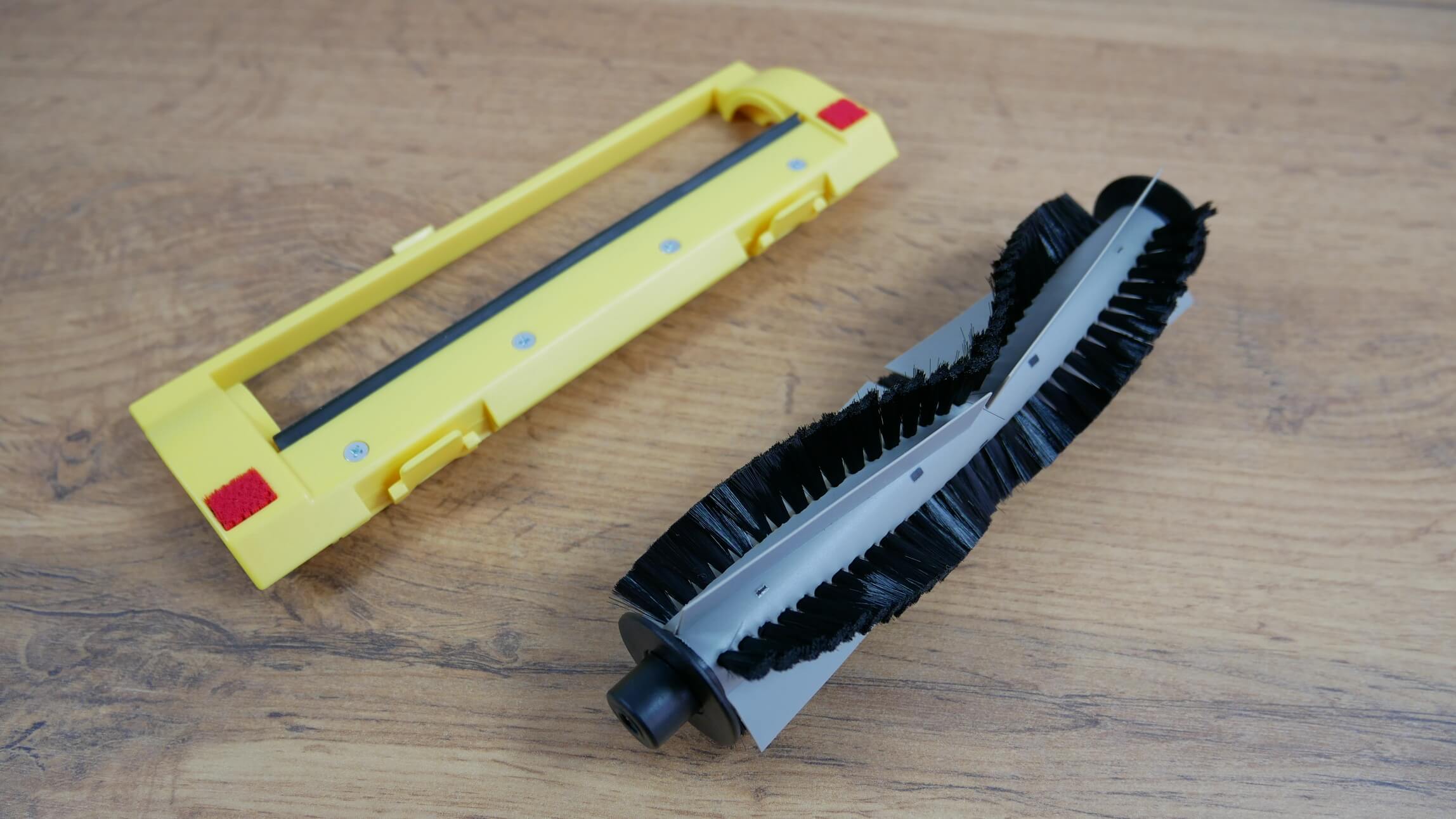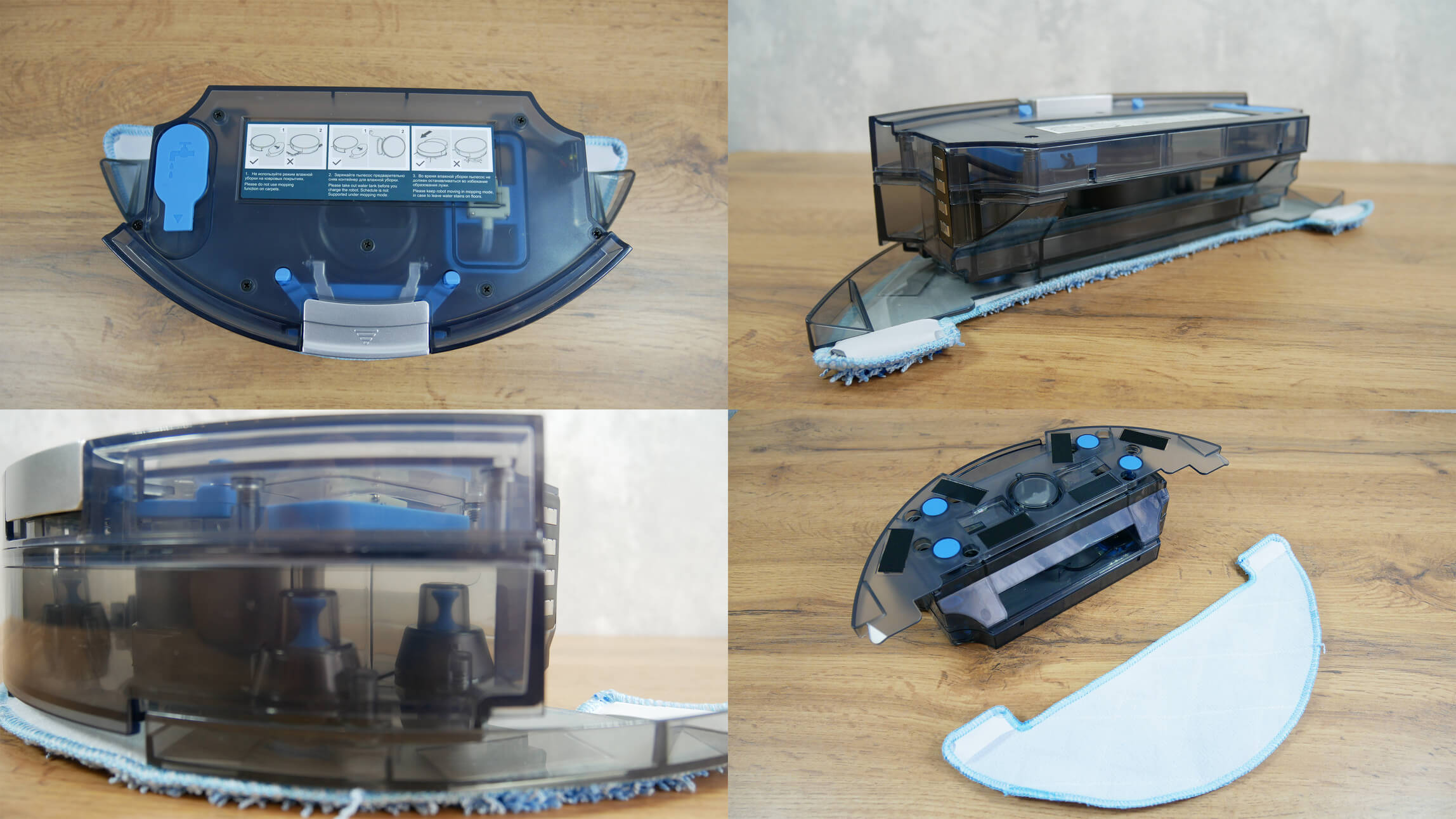 Valymo šluostė prie platformos pritvirtinta lipdukais ir elastinėmis juostelėmis. Taip pat verta paminėti, kad skysčio srautas valdomas elektroniniu būdu. Roboto apačioje sumontuoti trys apsaugos nuo kritimo jutikliai. Yra du šoniniai šepečiai. Jie yra greito atleidimo, trijų sijų ir turi šerelių šepečius.