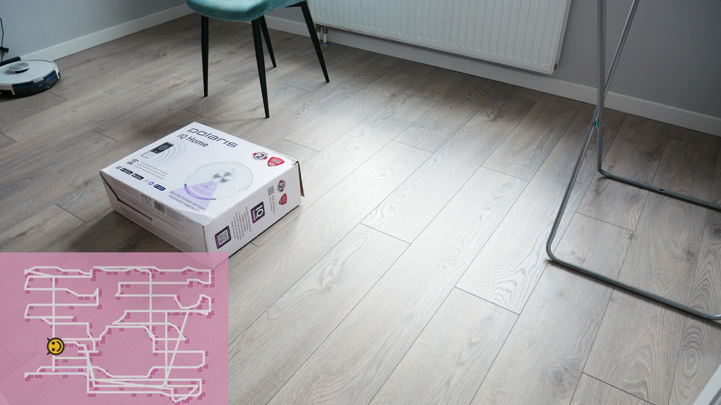Galiausiai pereikime prie bandymų. Pirmiausia išbandysime „Polaris PVCR 3900 IQ Home“ navigaciją kambaryje su kliūtimis. Palikęs bazę, robotas dulkių siurblys išvalo visą prieinamą plotą vingiuotu raštu. Jis neužstrigo ant džiovyklės. Tačiau jis nevalė aplink dėžę ar kėdžių kojas. Perimetro valymas neįtrauktas į automatinio valymo režimą.