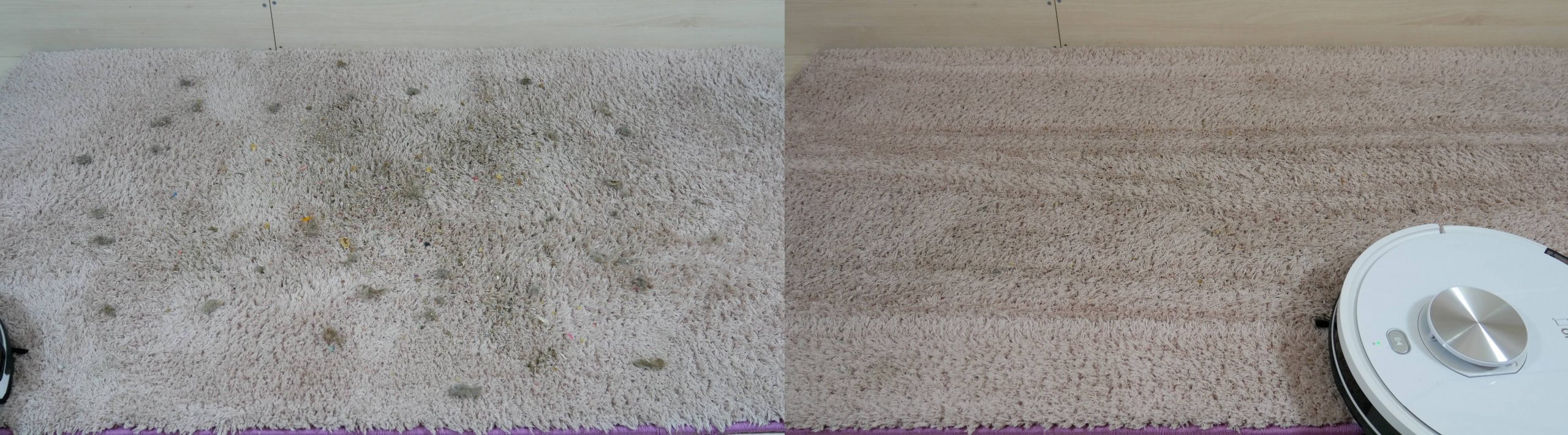 Kilimų valymo našumas puikus; robotas sugebėjo surinkti šiukšles, kruopščiai išvalydamas purų, vidutinio plauko kilimą. Testas svarbus!