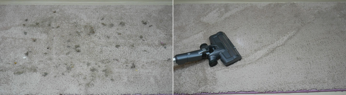 Tos pačios šiukšlės buvo išbarstytos ant kilimo, o dulkių siurblys atliko tokį pat gerą darbą, kruopščiai jį išvalydamas. Maksimaliu galingumu jis taip stipriai siurbė kilimą, kad buvo nepatogu jį naudoti, todėl perjungiau į vidutinį galingumą, kurio taip pat daugiau nei pakako.