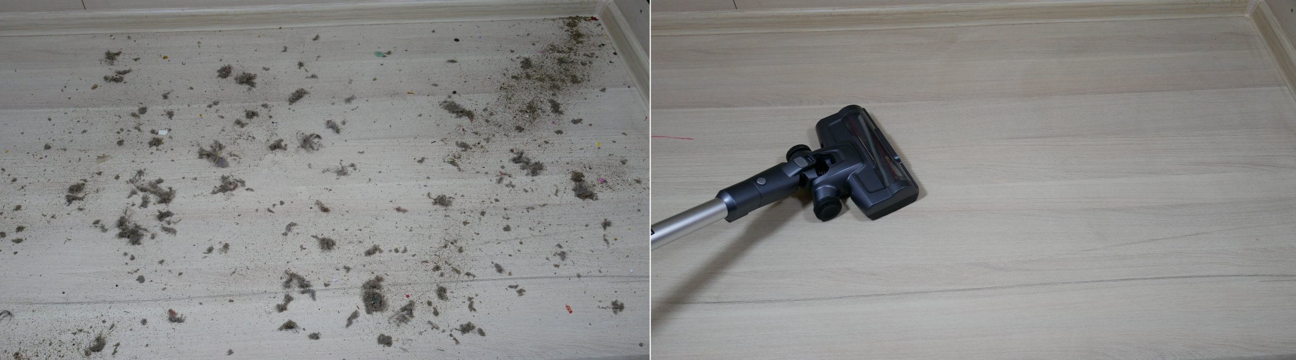 Dabar patikrinkime, kaip gerai „Polaris PVCS 4060 CyclonicSmart“ surenka grindų šiukšles. Ant laminuotų grindų išbarsčiau įvairių rūšių šiukšles: plaukus, kailį, grūdus ir kitas smulkias buitines šiukšles. Ši mašina veikė gerai. Svarbu pažymėti, kad ji be jokių problemų surenka šiukšles palei grindjuostes ar kampuose. Ji kruopščiai surenka viską, nepalikdama aklųjų zonų. Volelis beveik nesurenka plaukų ar pūkelių. Testas išlaikytas!