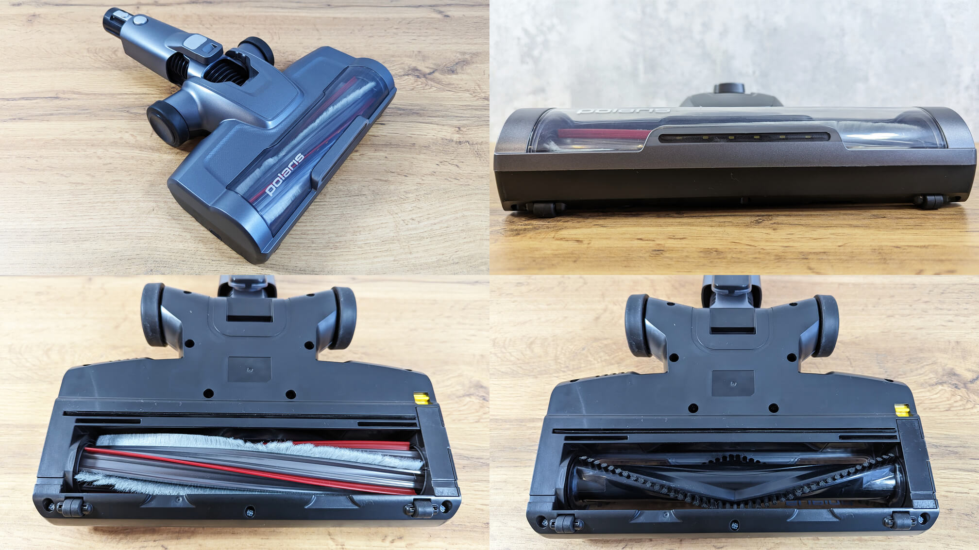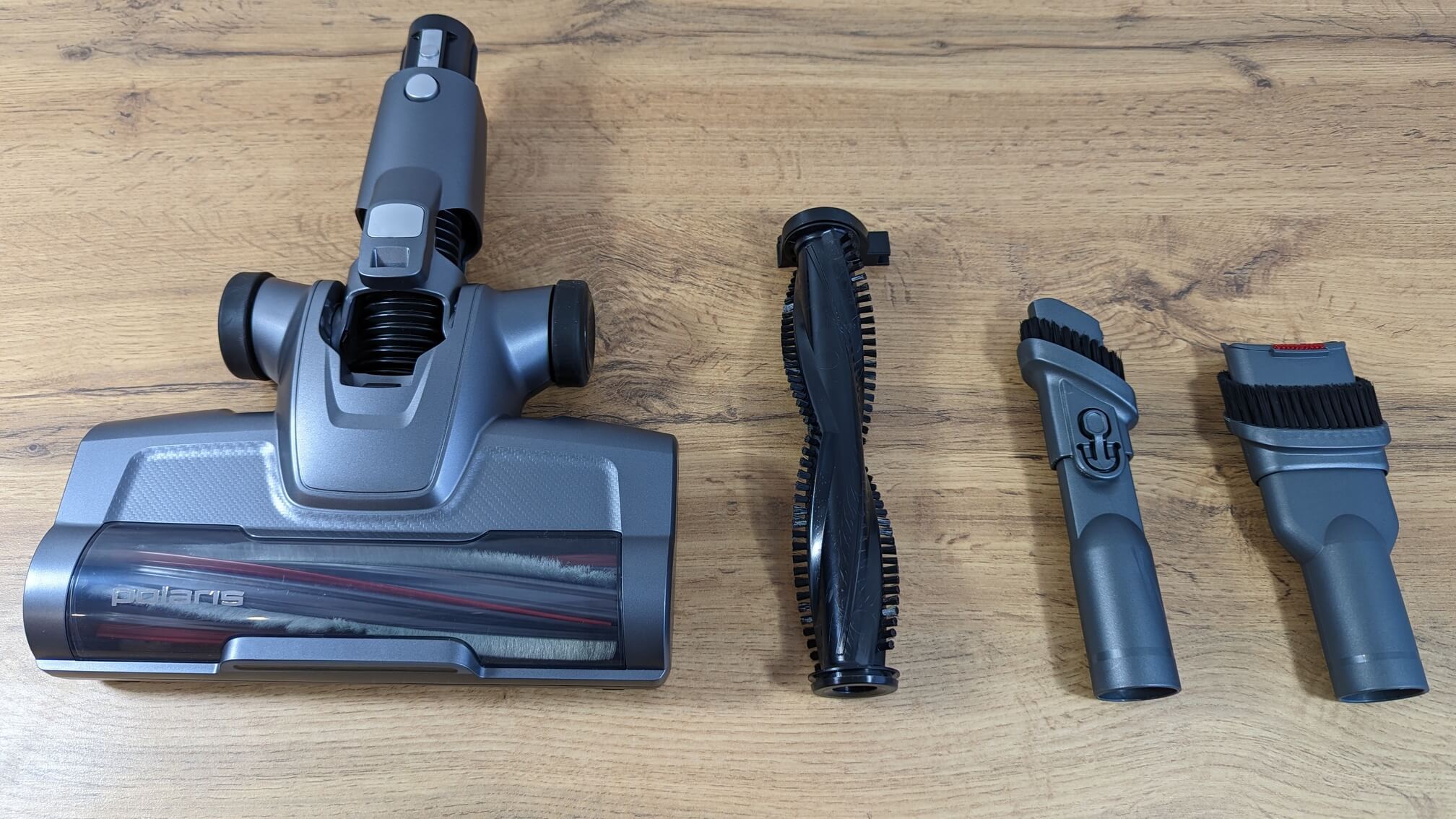 Dabar pažvelkime į pridedamus priedus. Pagrindinis grindų antgalis turi pasukamą jungtį ir LED apšvietimą priekyje. Volelis tvirtinamas fiksatoriumi be įrankių, o tai yra privalumas. Išpakavus antgalį, pridedamas volelis su trumpais, lanksčiais šereliais. Jis geriau tinka kilimams valyti. Keičiamas šerelių-žiedlapių volelis yra universalesnis, tinka visiems grindų paviršiams, be to, juo lengviau pašalinti plaukus ir naminių gyvūnėlių plaukus. Taip pat verta paminėti didelius guminius ratukus ant pagrindinio antgalio, kurie taip pat padeda manevruoti dulkių siurbliu. Norėdami tai padaryti, pakreipkite dulkių siurblį į priekį, kad užfiksuotumėte grindų šepetį ir galėtumėte ridenti dulkių siurblį, o ne jį nešti.
