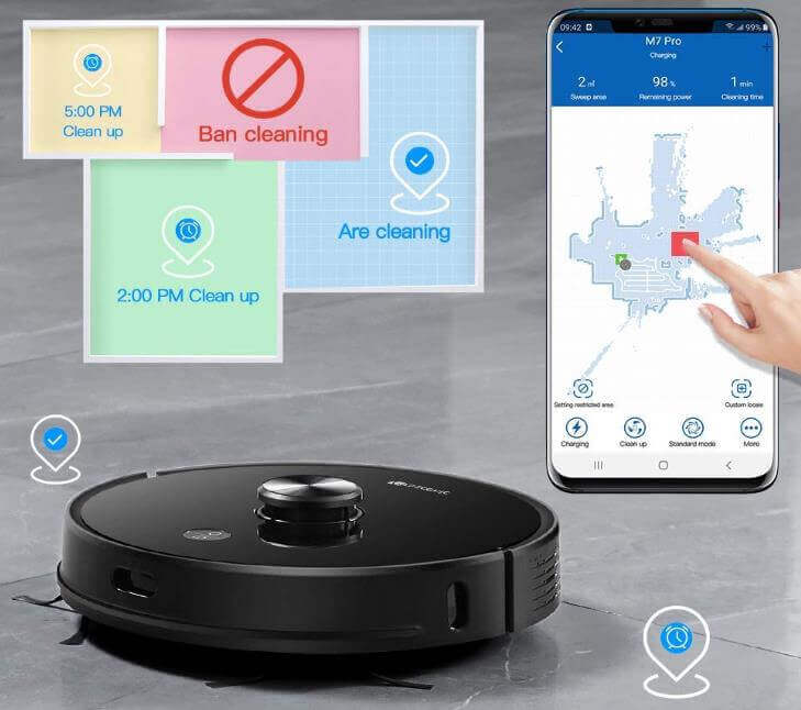 „Proscenic M7 Pro“ sukuria kambario žemėlapį ir jį įsimena po pirmojo valymo ciklo. Tai reiškia, kad įrenginiui nereikia kaskart jo iš naujo kurti. Be to, jis gali išsaugoti daugiau nei vieną žemėlapį, tai reiškia, kad vartotojai programėlėje gali išsaugoti kelių aukštų žemėlapius, o tai labai patogu namams su keliais aukštais.