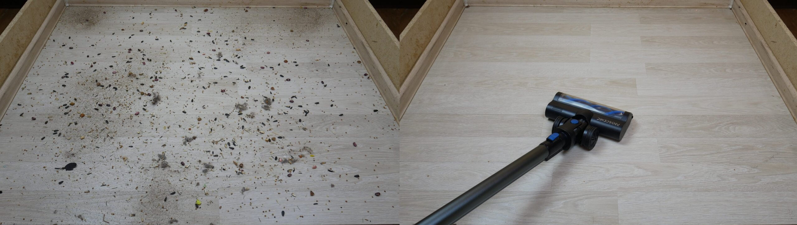 „Proscenic P11“ šią užduotį atliko šiek tiek prasčiau ir tik iš dalies išsiurbė šiukšles iš 10 mm tarpo, nors gali susidoroti su 8 mm.