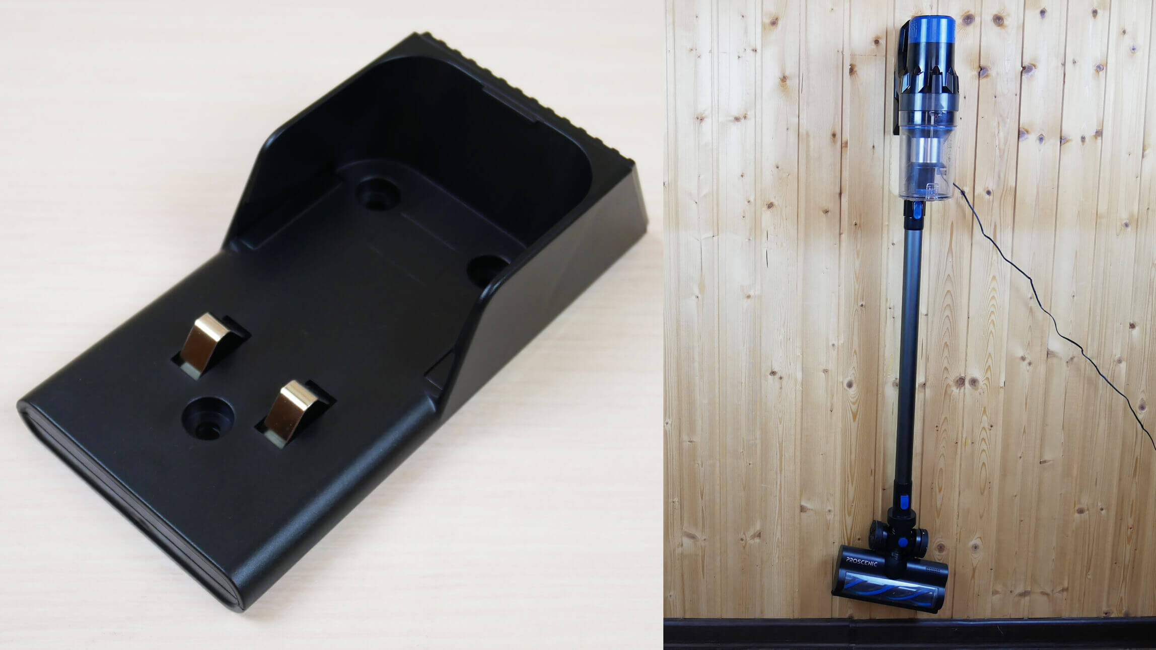Dulkių siurblio, pritvirtinto prie sienos, įkrovimo akumuliatoriaus gnybtai yra rankenos apačioje. Baterija yra nuimama, o tai yra privalumas.