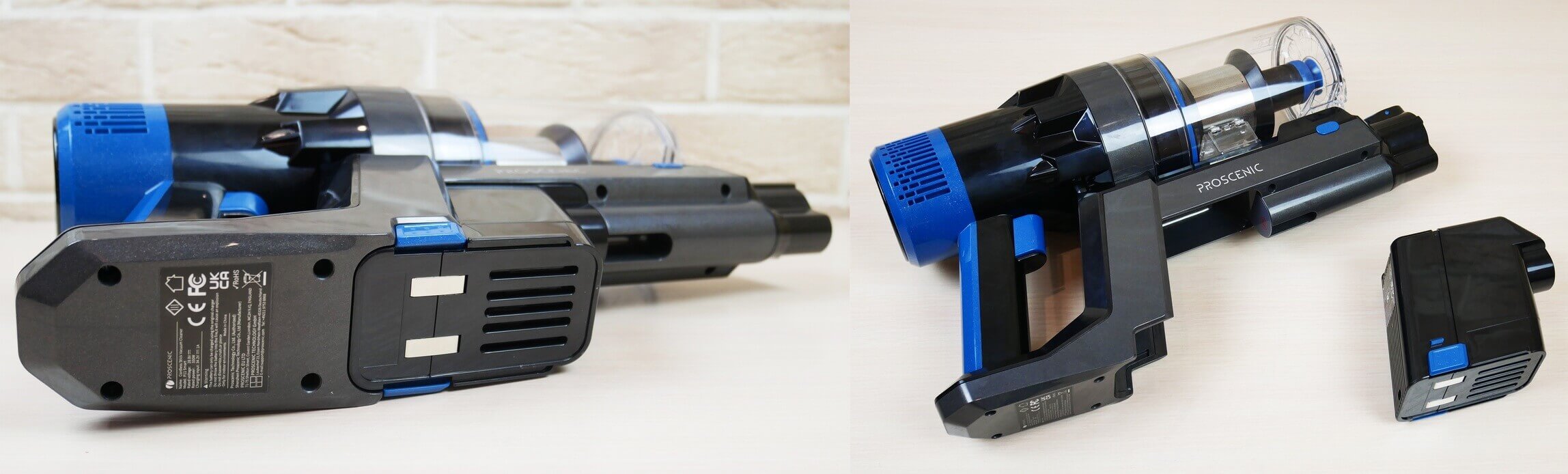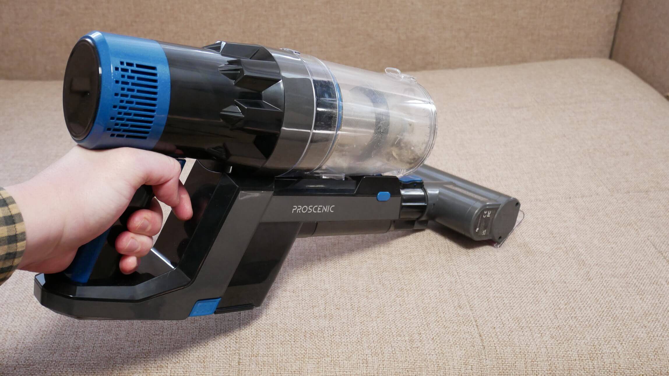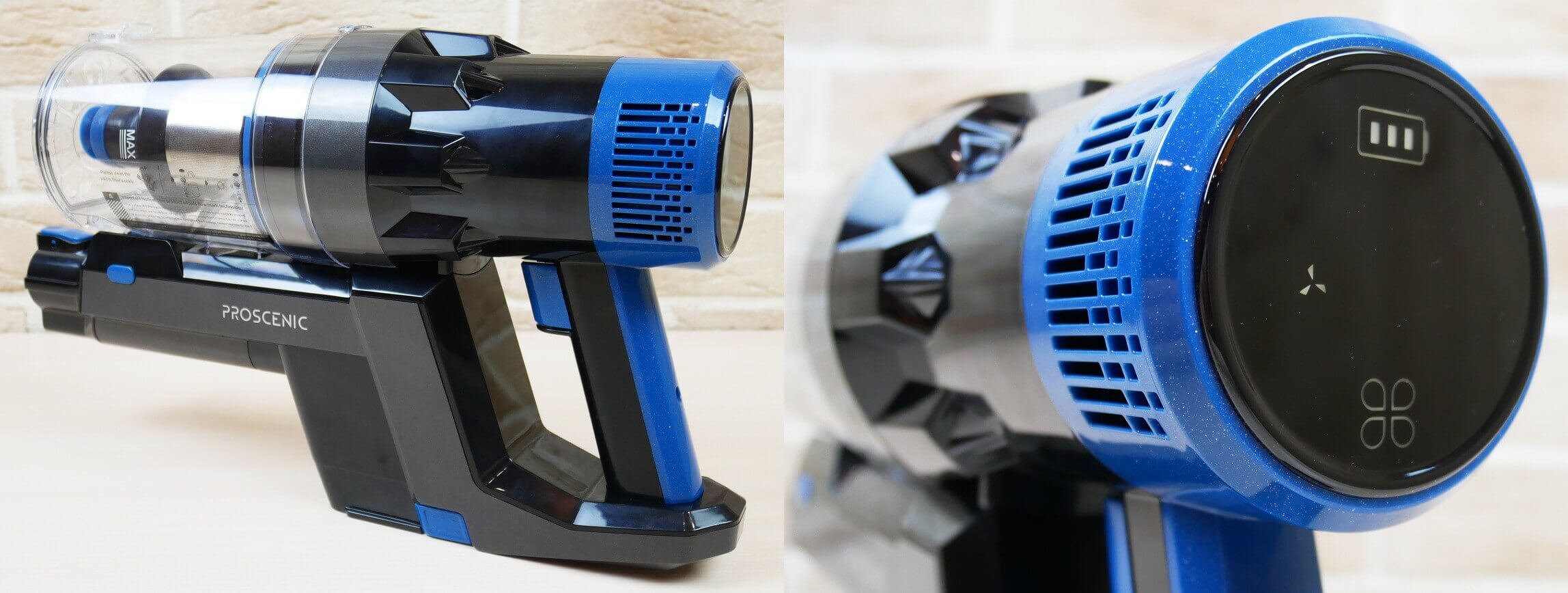 Pažvelkime į „Proscenic P11 Smart“ dizainą. Jis yra grafito, juodos ir mėlynos spalvų derinio. Dulkių siurblys įjungiamas ir išjungiamas paspaudus gaiduką. Informacinis ekranas su jutikliniu mygtuku siurbimo galiai reguliuoti yra gale. Galimi trys režimai: minimali galia, automatinis ir turbo režimas. Automatiniu režimu „Proscenic P11 Smart“ automatiškai padidina siurbimo galią, kai aptinka kilimus.