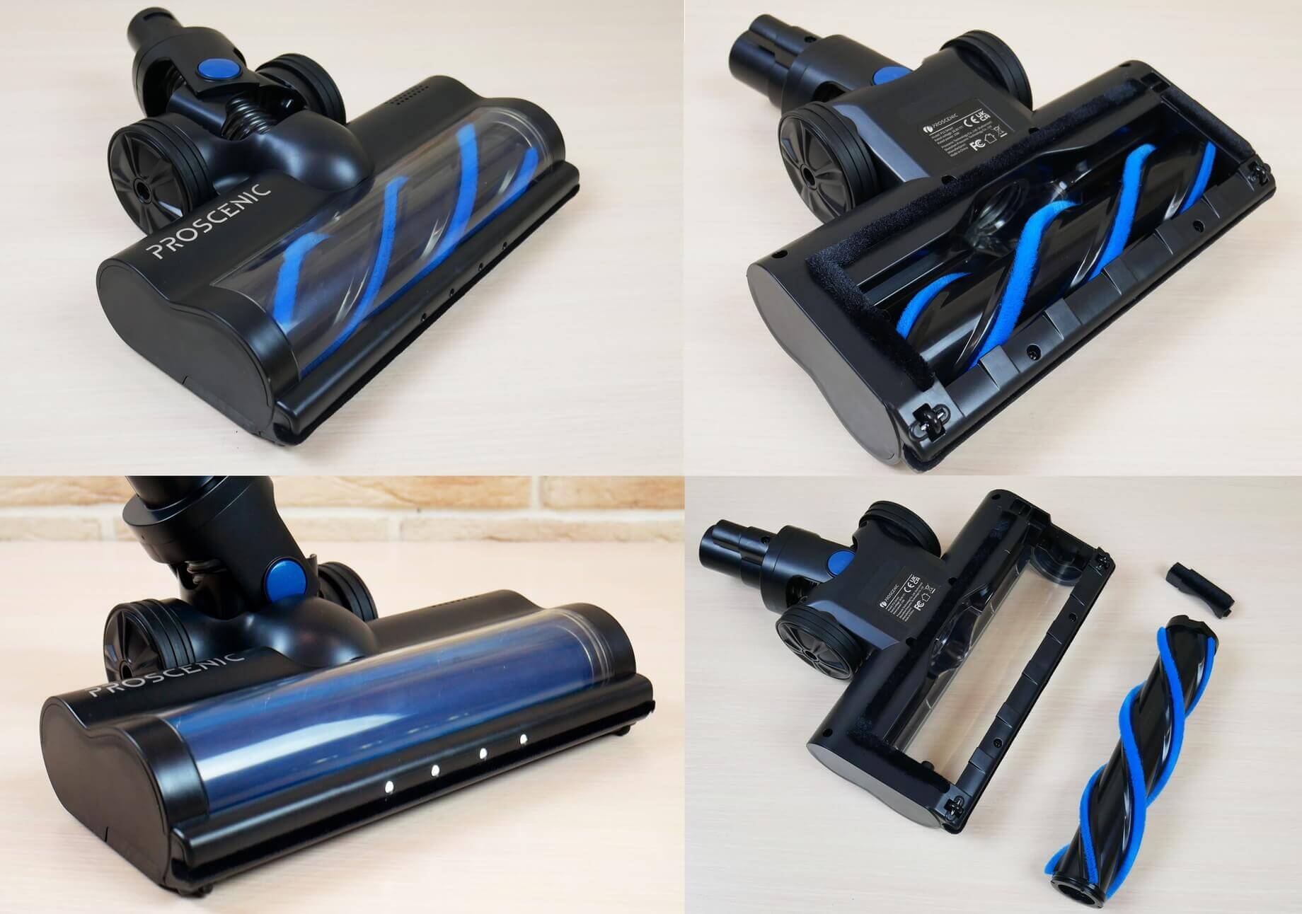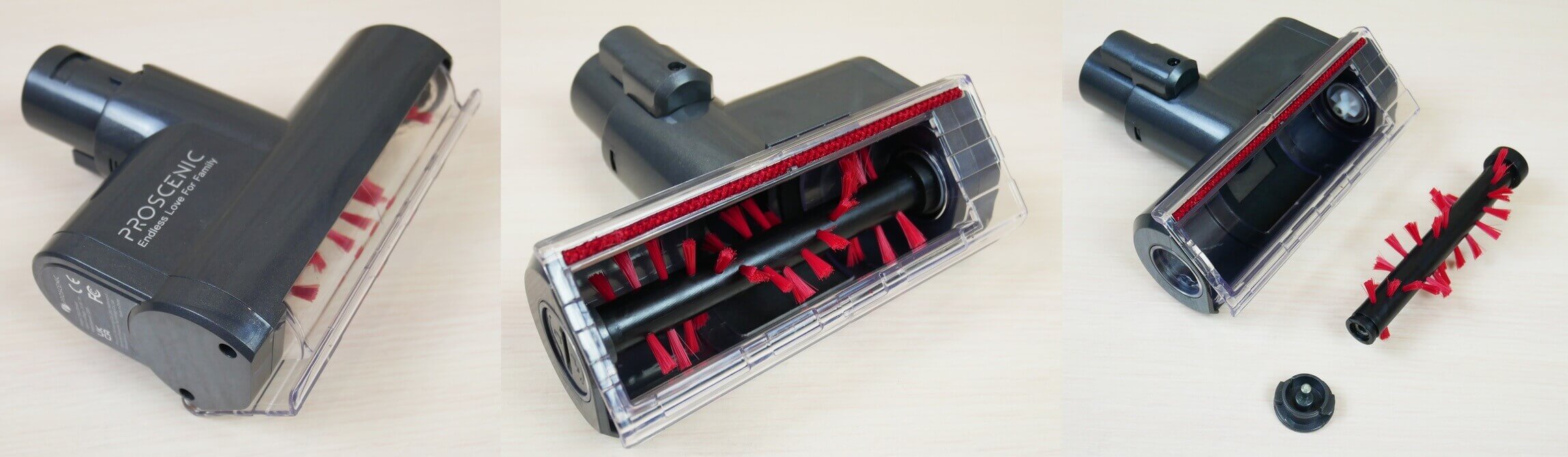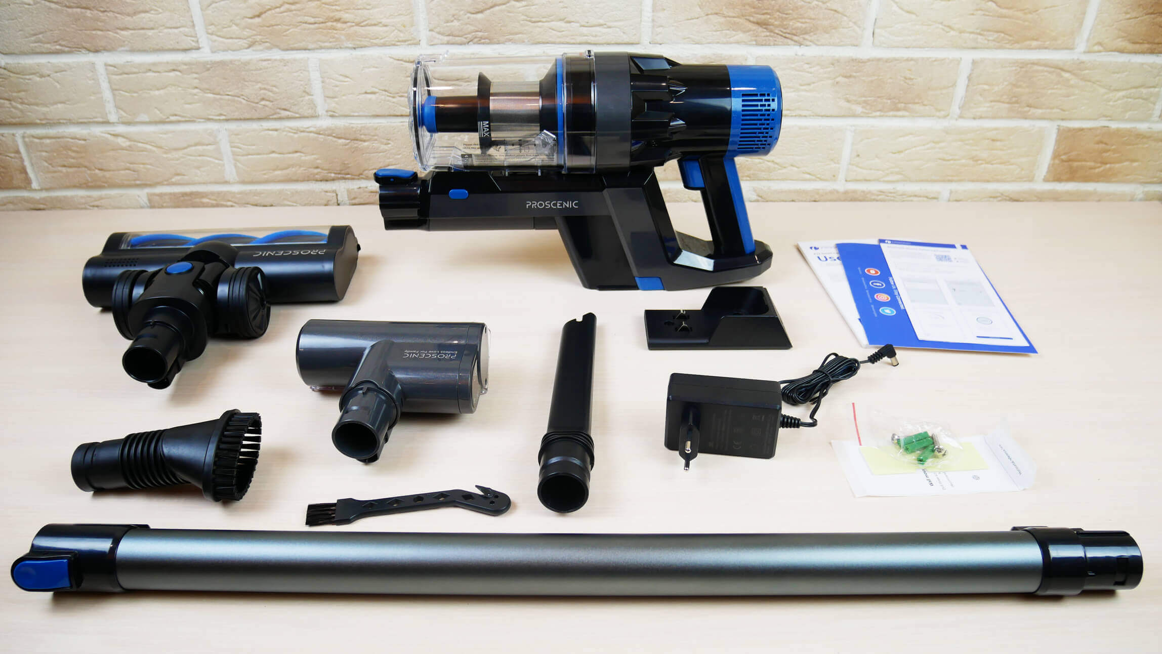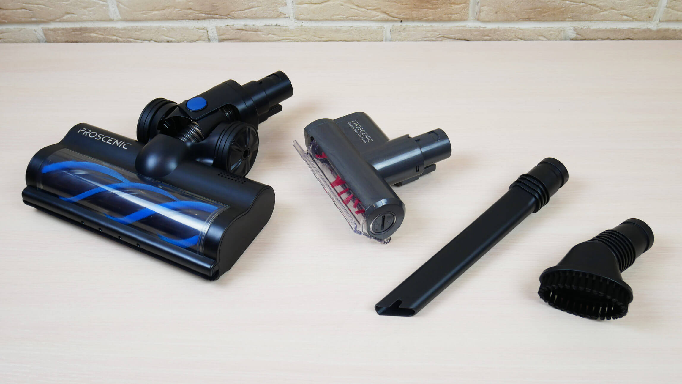 Komplekte yra visi reikalingi priedai ir antgaliai dulkių siurbliui valdyti. Tačiau, palyginti su „Proscenic P11“, svarbu atkreipti dėmesį, kad šlapio valymo antgalis yra pašalintas.
