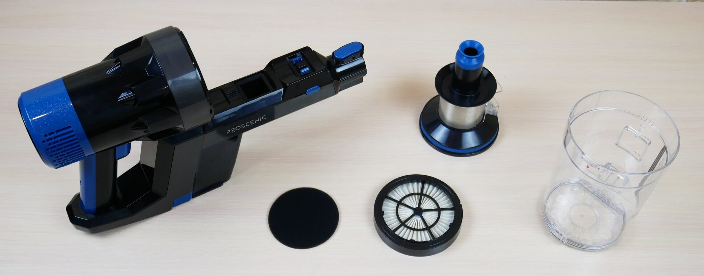 Dulkių talpyklą lengva nuimti paspaudus mėlynai paryškintus atlaisvinimo mygtukus. Talpyklos dugnas atsidaro iš apačios, kad būtų lengva ištuštinti. Filtravimo sistema yra keturių sluoksnių: HEPA, putplasčio filtras, ciklonas ir tinklelis.