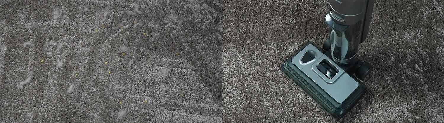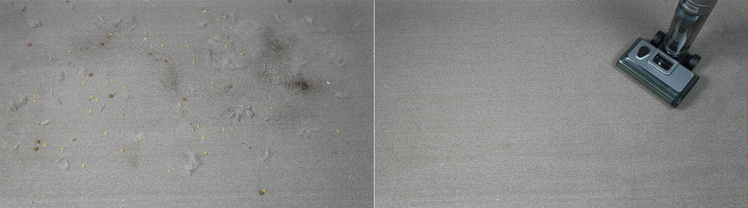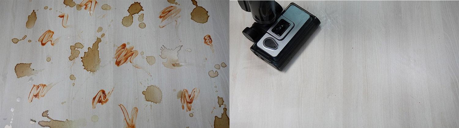 Šis dulkių siurblys pašalino net sunkiai įveikiamas, pridžiūvusias kavos ir padažo dėmes. Kaip ir su panašiais dulkių siurbliais, padažo dėmėms pašalinti prireikė šiek tiek laiko. Tiksliau sakant, dėmei pašalinti prireikė 8 minučių. Tai šiek tiek geriau nei dauguma biudžetinių ir vidutinės kainos dulkių siurblių, kurie paprastai pašalina panašias dėmes per 10 minučių. Be to, nebuvo naudojama jokia skalbimo priemonė, nes gamintojas jos neprideda.