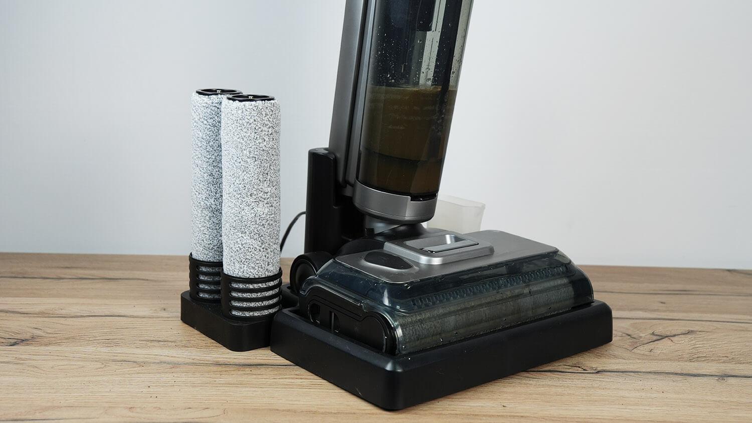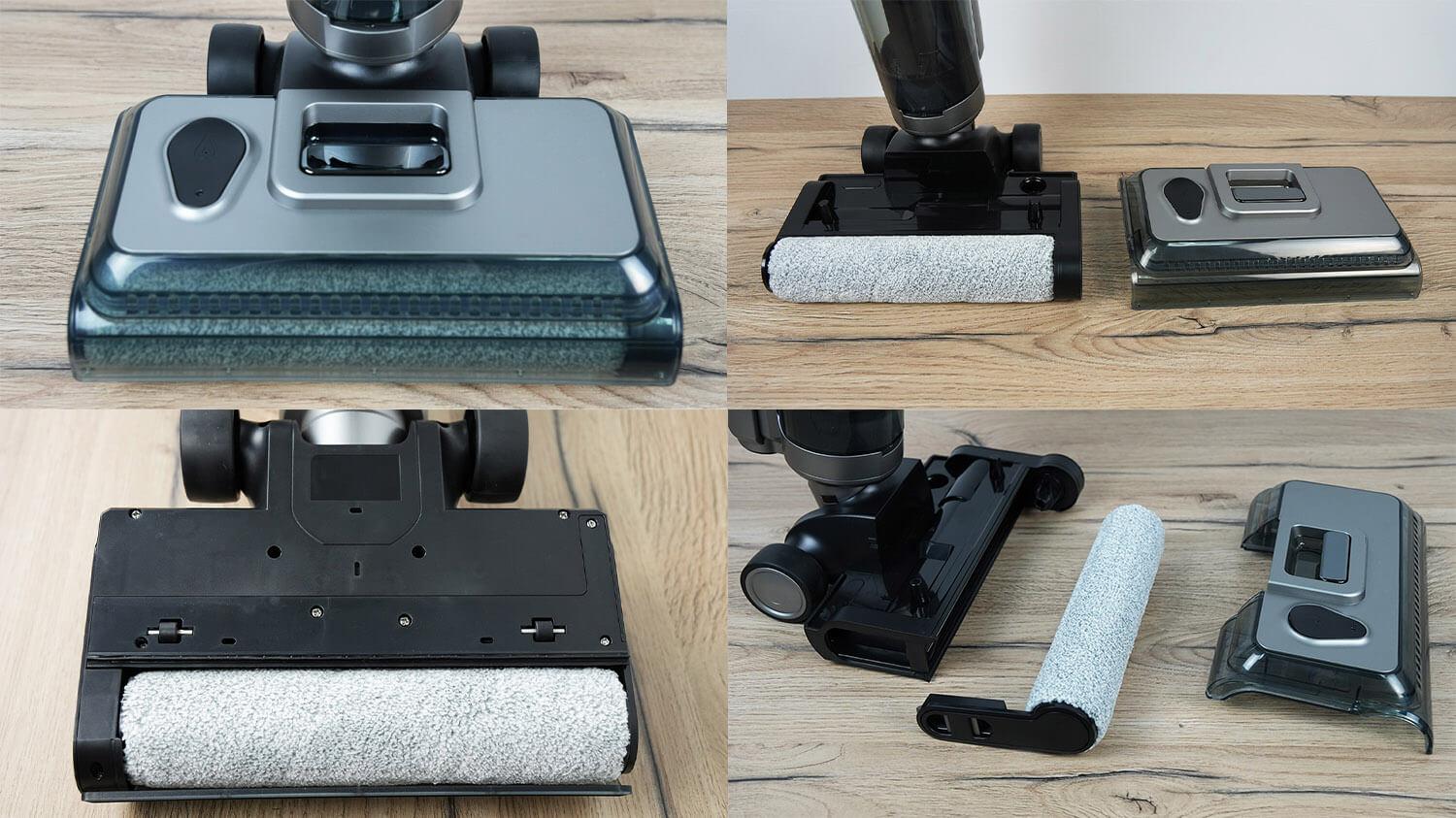 Pradėkime nuo valymo modulio. Volelis laikomas šoniniu fiksatoriumi. Konstrukcija pažįstama – minkšti, trumpi šereliai, kaip ir kituose šlapio/sauso valymo dulkių siurbliuose. Įdomu tai, kad volelis vienoje pusėje yra pastumtas korpuso krašto atžvilgiu, todėl sumažėja akloji zona tarp volelio krašto ir grindjuosčių ar baldų.