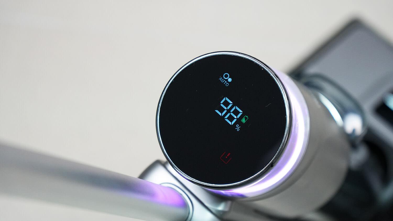 Visa informacija rodoma ekrane, aplink kurį matome šviesos indikatorių, rodantį dulkių siurblio būseną.