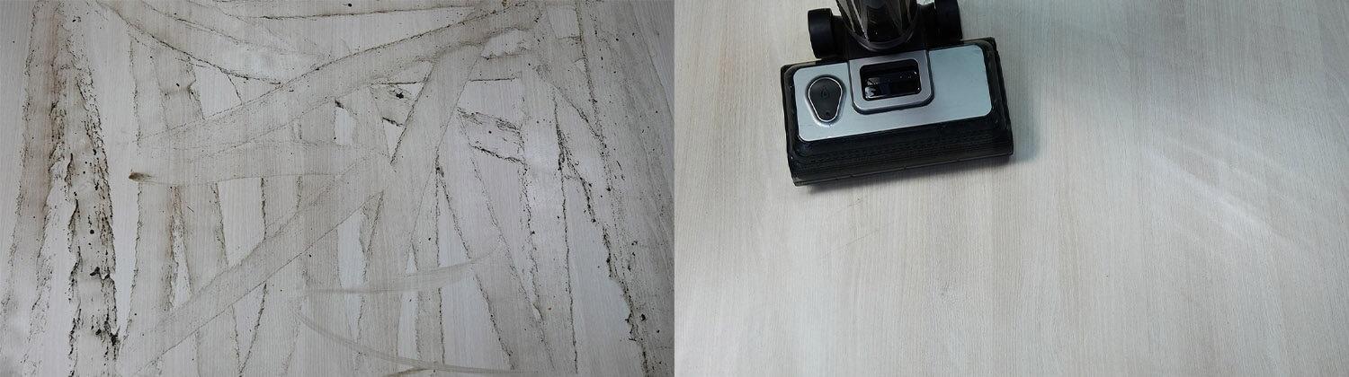 „Redkey W13“ taip pat gali būti naudojamas šiek tiek pridžiūvusiems nešvarumams nuo grindų valyti. Kaip matote, neliko jokių žymių ar dryžių. Grindys tampa idealiai švarios.