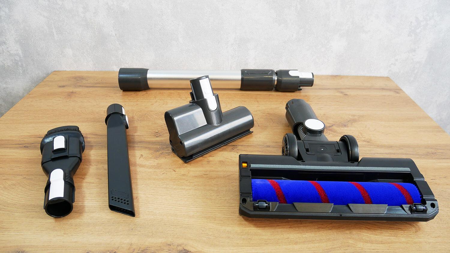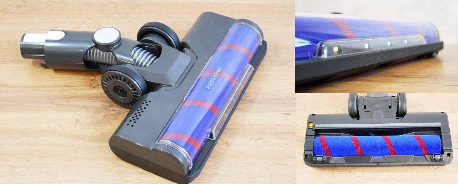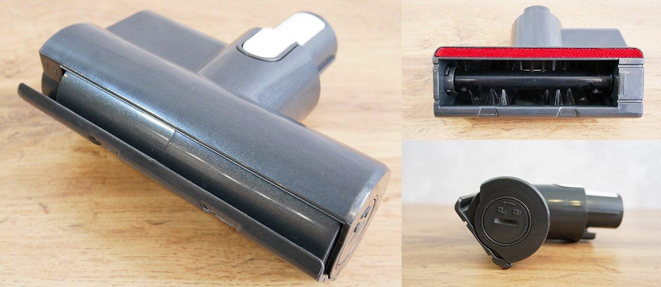 Pažvelkime į pridedamus priedus. Pagrindinis grindų antgalis turi lemputę, o tai yra privalumas. Šis antgalis turi volelį su minkštu, puriu galiuku. Šio tipo volelis tinka kietiems paviršiams valyti. Fiksavimo mechanizmą galima nuimti rankomis. Nereikia jokių papildomų įrankių.