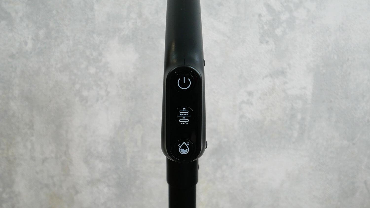Rankenoje yra mygtukai šlapio/sauso valymo dulkių siurbliui valdyti. Tai įjungimo/išjungimo, sauso ir šlapio valymo režimų perjungimo ir savaiminio valymo funkcijos įjungimo stotelėje mygtukai.