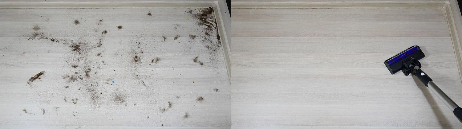 Galiausiai pereikime prie bandymų. Pirmiausia patikrinkime, kaip „REDMOND MultiClean RV-UR390“ atlieka savo pagrindinę užduotį – grindų valymą. Jis puikiai susidoroja su kasdieniu grindų valymu. Jokių nusiskundimų. Nepalieka jokių dryžių ar žymių, o vandens srautas yra vidutinis.