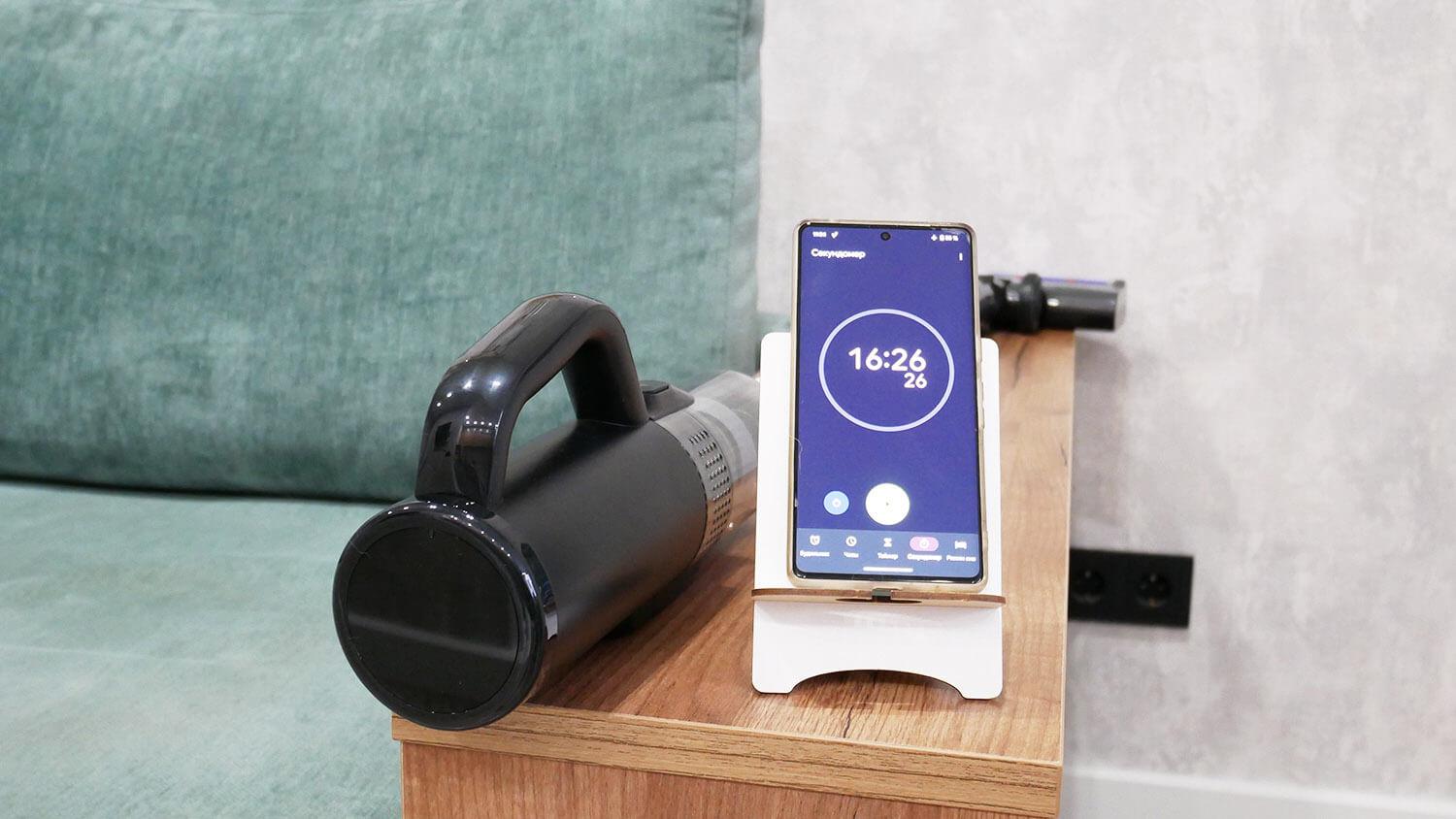 Taip pat išbandėme baterijos veikimo laiką esant maksimaliai galiai sauso siurbimo režimu. „REDMOND MultiClean RV-UR390“ veikė 16 minučių ir 26 sekundes maksimaliu galingumu. Tai labai geras rezultatas!