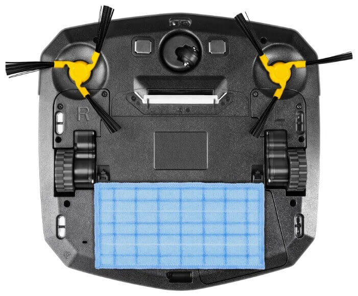 Žiūrint į robotą dulkių siurblį iš galo, galima pamatyti du ratukus su automatiniu išsijungimo mechanizmu, kai jie pakeliami nuo grindų, priekinį pasukamą ratuką, du besisukančius šepečius, siurbimo angą, kontaktinius padėklus montavimui ant įkrovimo pagrindo ir skyles antgaliui su šluoste pritvirtinti.