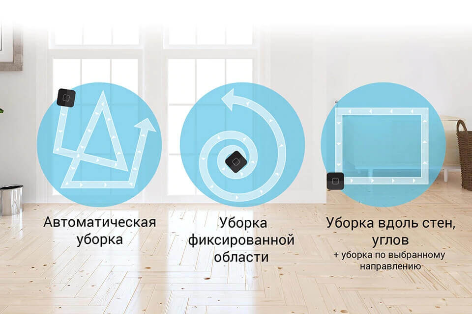 Pasirinkite vieną iš režimų naudodami nuotolinio valdymo pultą. REDMOND RV-R250 robotas dulkių siurblys taip pat gali valyti grindis šluoste, kurią reikia sudrėkinti vandeniu ir pritvirtinti prie apačios.