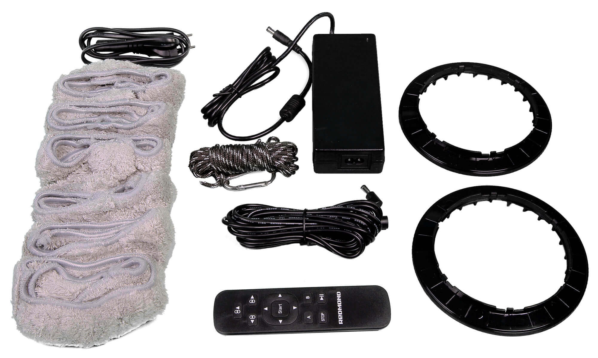 Visas rinkinys telpa į vidutinio dydžio gofruoto kartono dėžę. Pati dėžutė yra švaraus, modernaus dizaino. Joje yra „Redmond RV-RW001“ nuotraukos, taip pat jo specifikacijos ir savybės. Rinkinį sudaro: