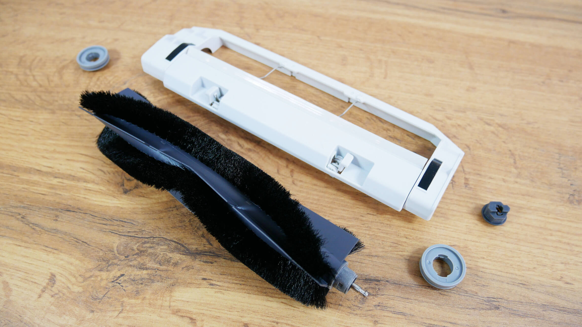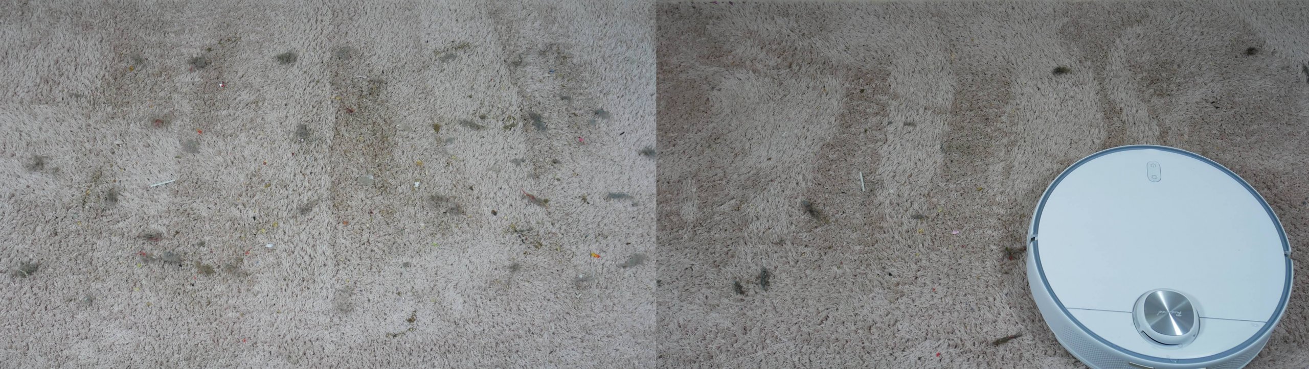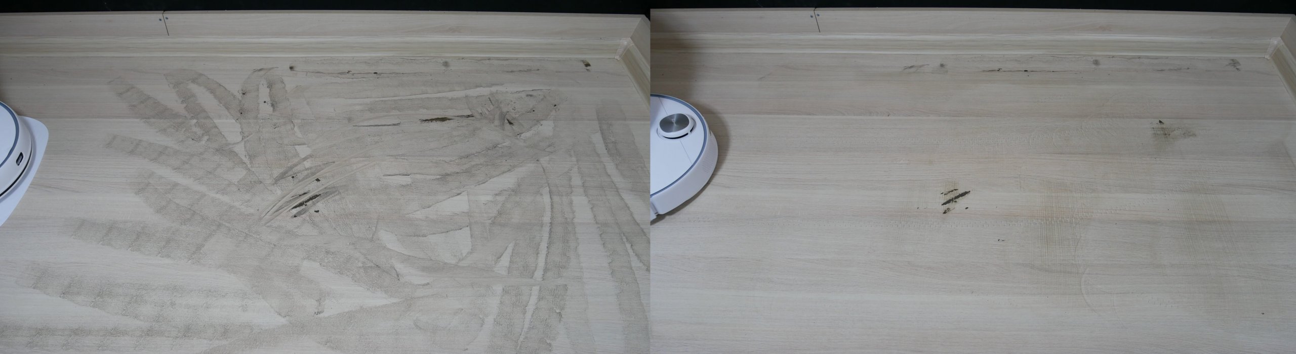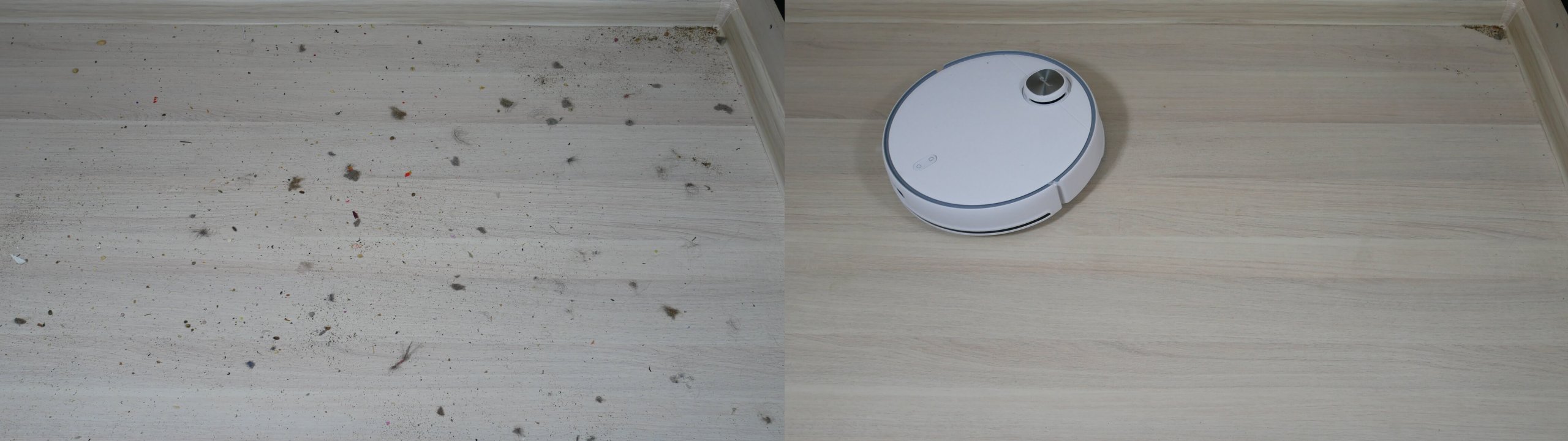 Laminuotų grindų šiukšlių surinkimo kokybė buvo puiki. Robotas visiškai surinko šiukšles ant grotelių, palikdamas tik nedidelį kiekį jų kampuose dėl apvalios formos. Keletas plaukų įstrigo centriniame šepetyje, bet didžioji dalis šiukšlių buvo surinkta dulkių konteineryje. Bandymas sėkmingai išlaikytas!