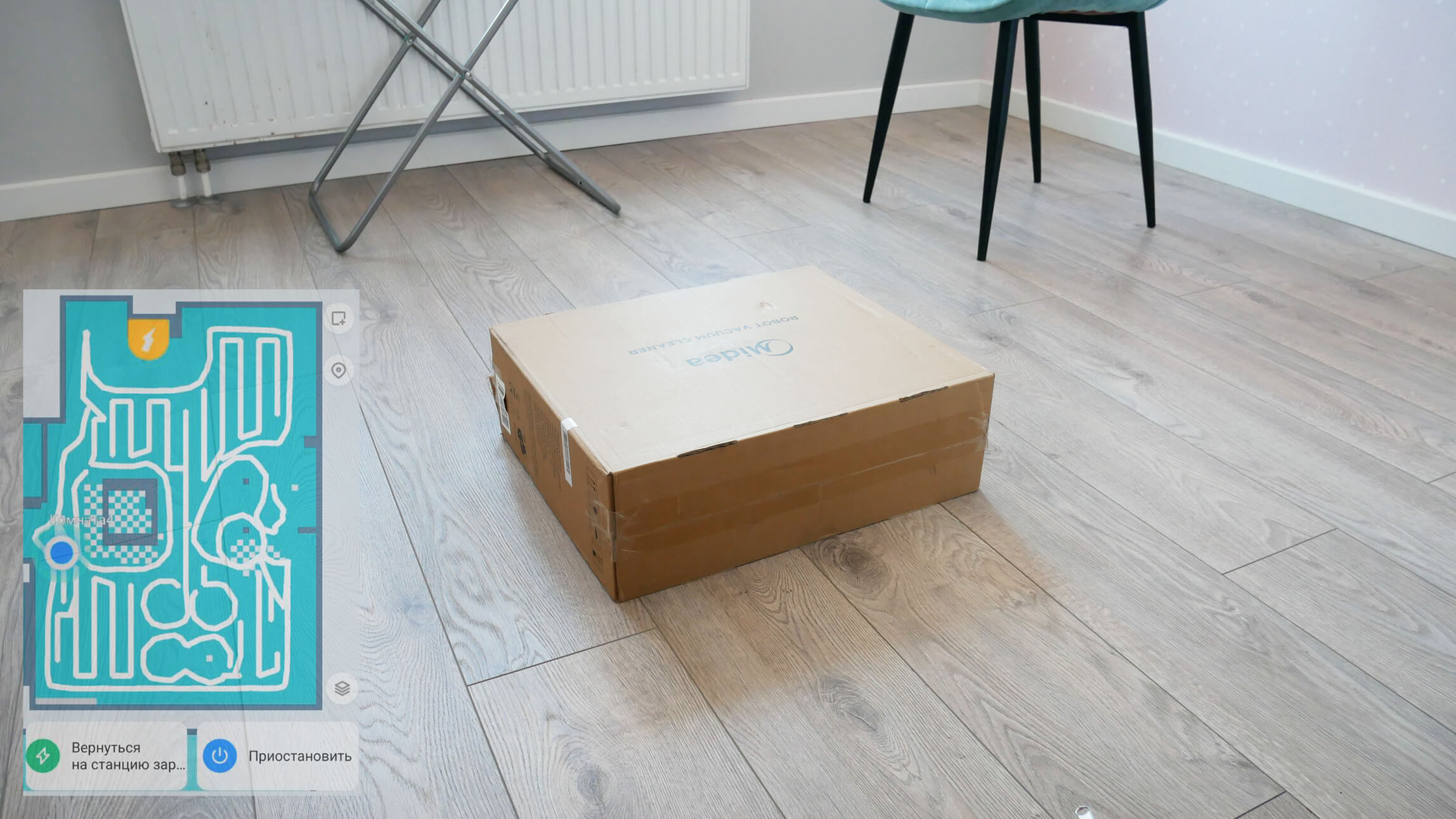 Pastarąjį punktą aptarsiu atskirai. Jei paimsite robotą, perkelsite jį kur nors ir įjungsite, jis nevalys. Jis praneš jums, kad perkeltumėte jį į stotelę ir paleistumėte valymą iš ten. Tai gali būti nepatogu, kai robotas naudojamas dviejų aukštų name, pavyzdžiui, jei norite, kad jis siurbtų tik antrą aukštą. Panaši situacija netgi įvyko tame pačiame aukšte, kai perkėliau robotą į kitą kambarį ir jį įjungiau. Jis iš karto grįžta į stotelę.