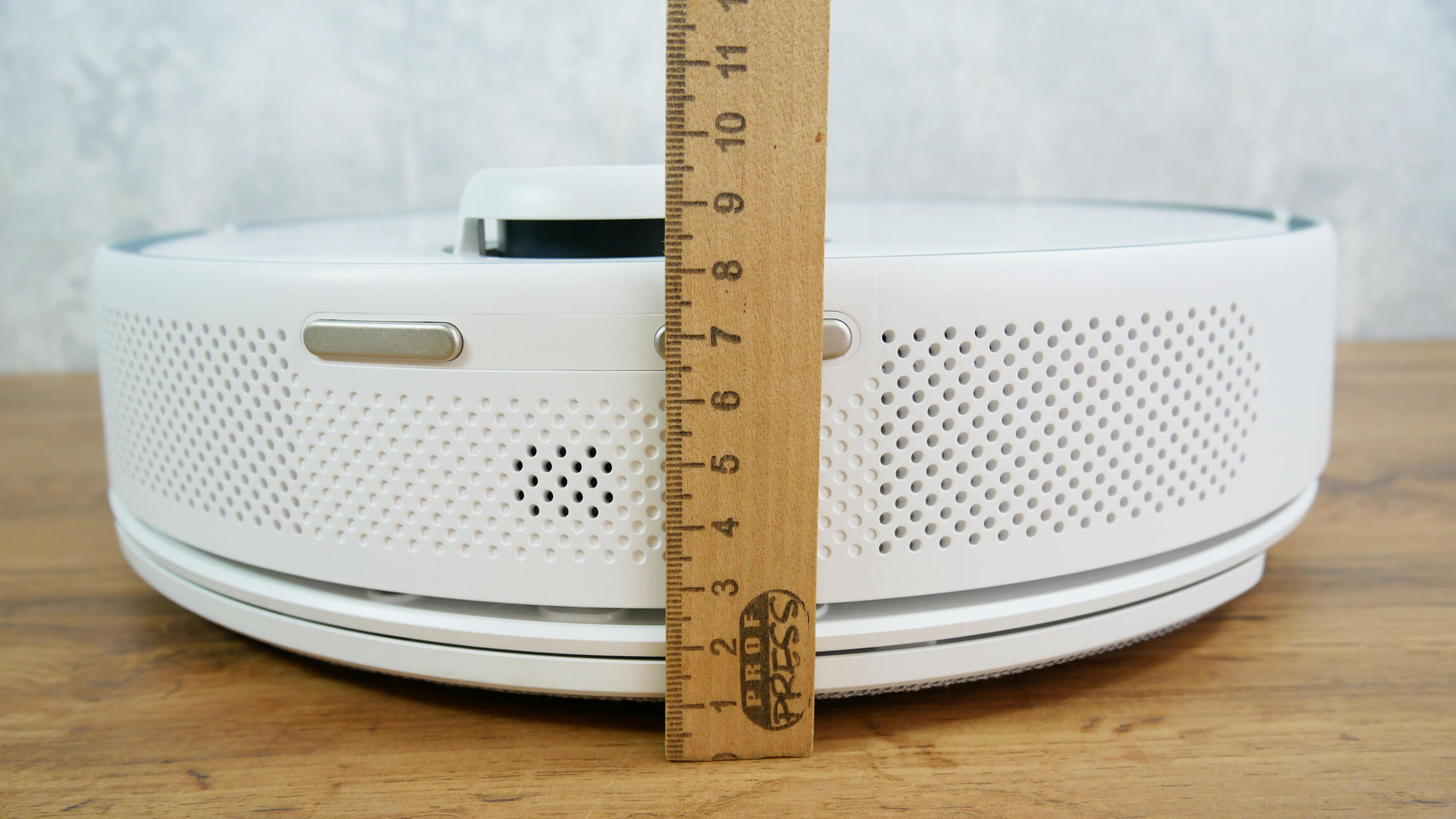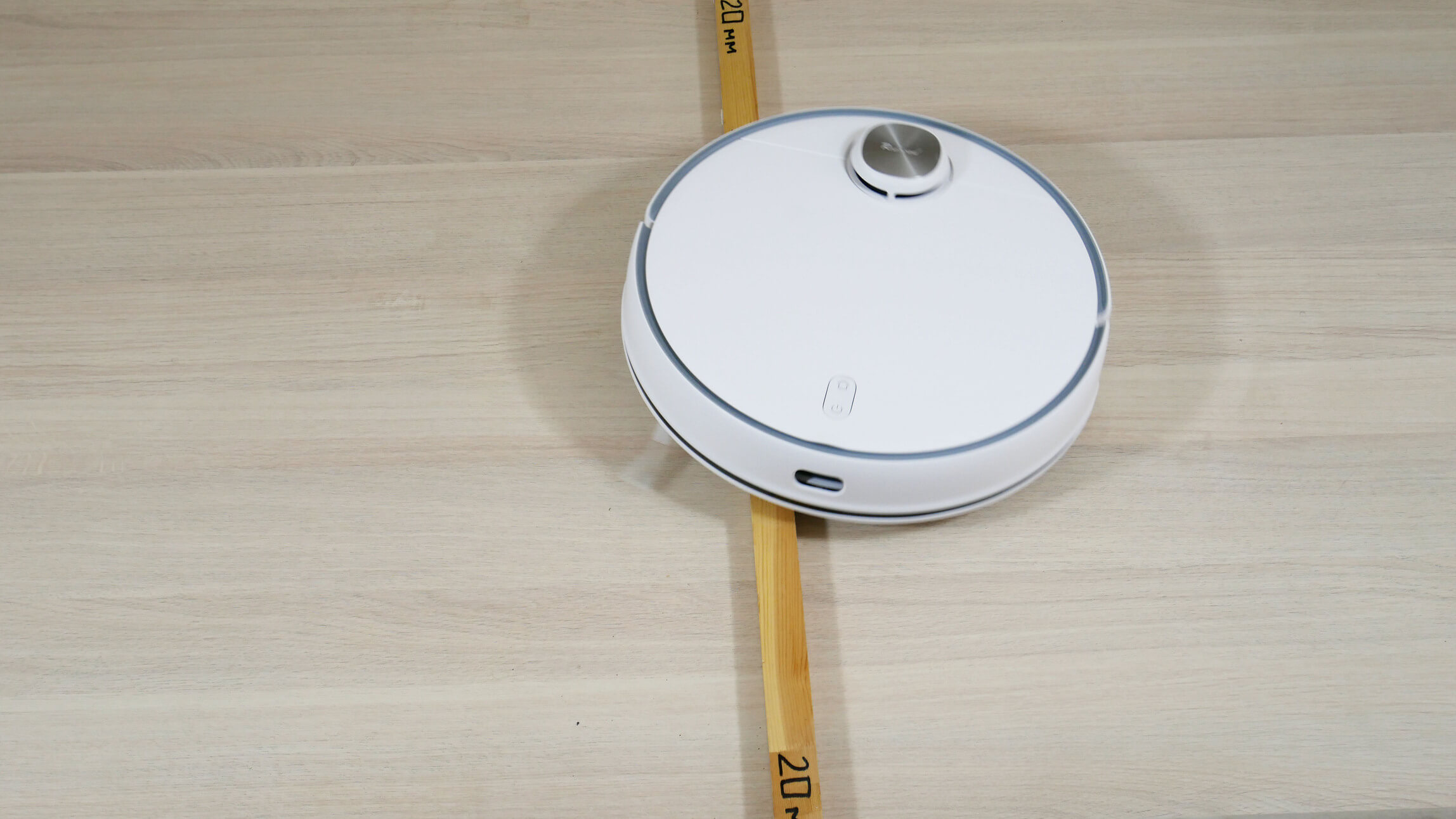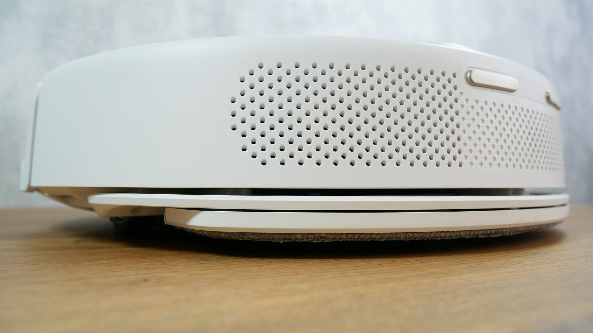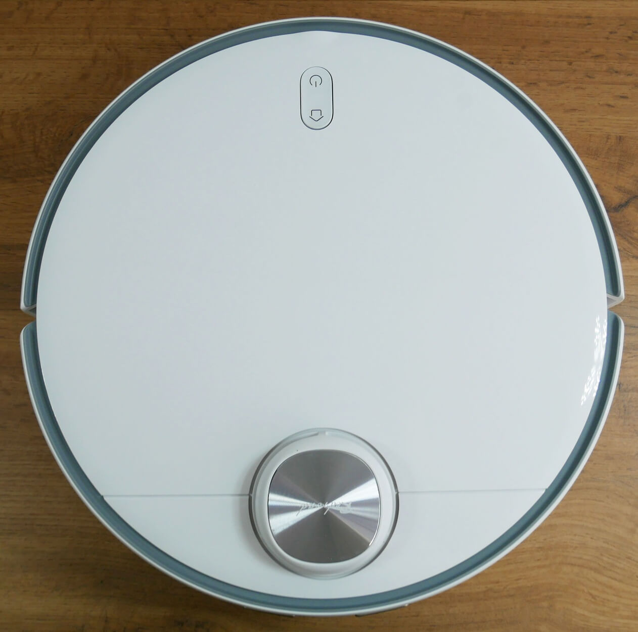 Pirmiausia pažvelkime į patį robotą dulkių siurblį. Jis apvalus, baltas ir stovi 96 mm aukštyje nuo grindų.