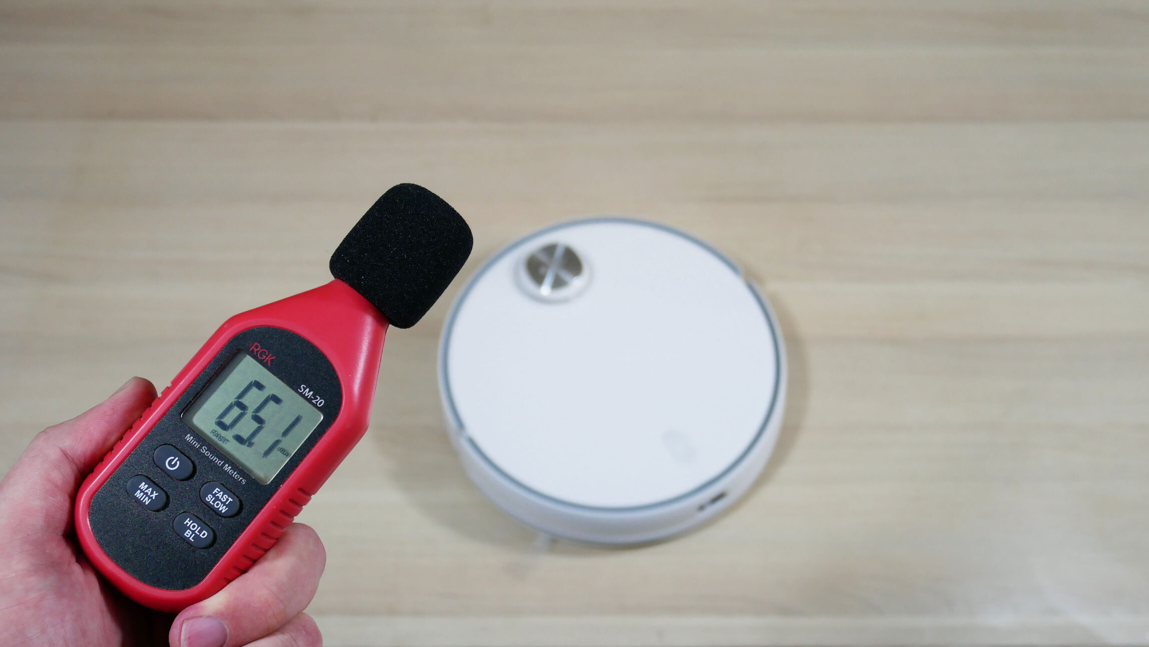 Galiausiai išmatavome „Redroad G10“ triukšmo lygį skirtingais režimais. Tyliuoju režimu triukšmo lygis svyruoja nuo 56 iki 58 dB. Standartiniu režimu jis padidėja iki 59–61 dB. Esant vidutinei galiai, triukšmo lygis siekia 65 dB, o maksimaliu režimu didžiausias triukšmo lygis buvo 67,5 dB. Šio roboto dulkių siurblio triukšmo lygis yra standartinis.