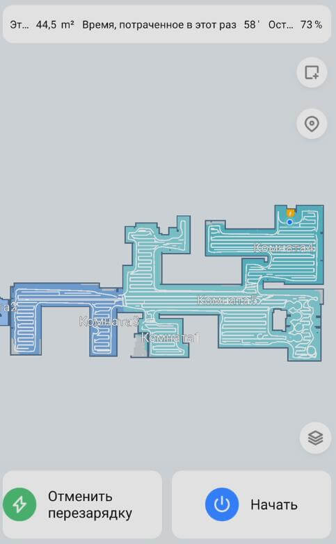 Galiausiai pereikime prie bandymų. Pirmiausia išbandysime „Redroad G10“ navigaciją kambaryje su kliūtimis. Jis naviguoja per visą plotą išilgai perimetro, o tada – gyvatėmis. Šluostė automatiškai pakyla nuo grindų, kai uždedama ant džiovyklės kojų ir peržengiant slenksčius, taip pagerindama roboto manevringumą. Dėl to robotas neužstrigdavo ant džiovyklės kojų ir galėjo atskirai išvalyti aplink visas kėdžių ir dėžių kojas, prieš grįždamas į savo pagrindą. Bandymas sėkmingas!