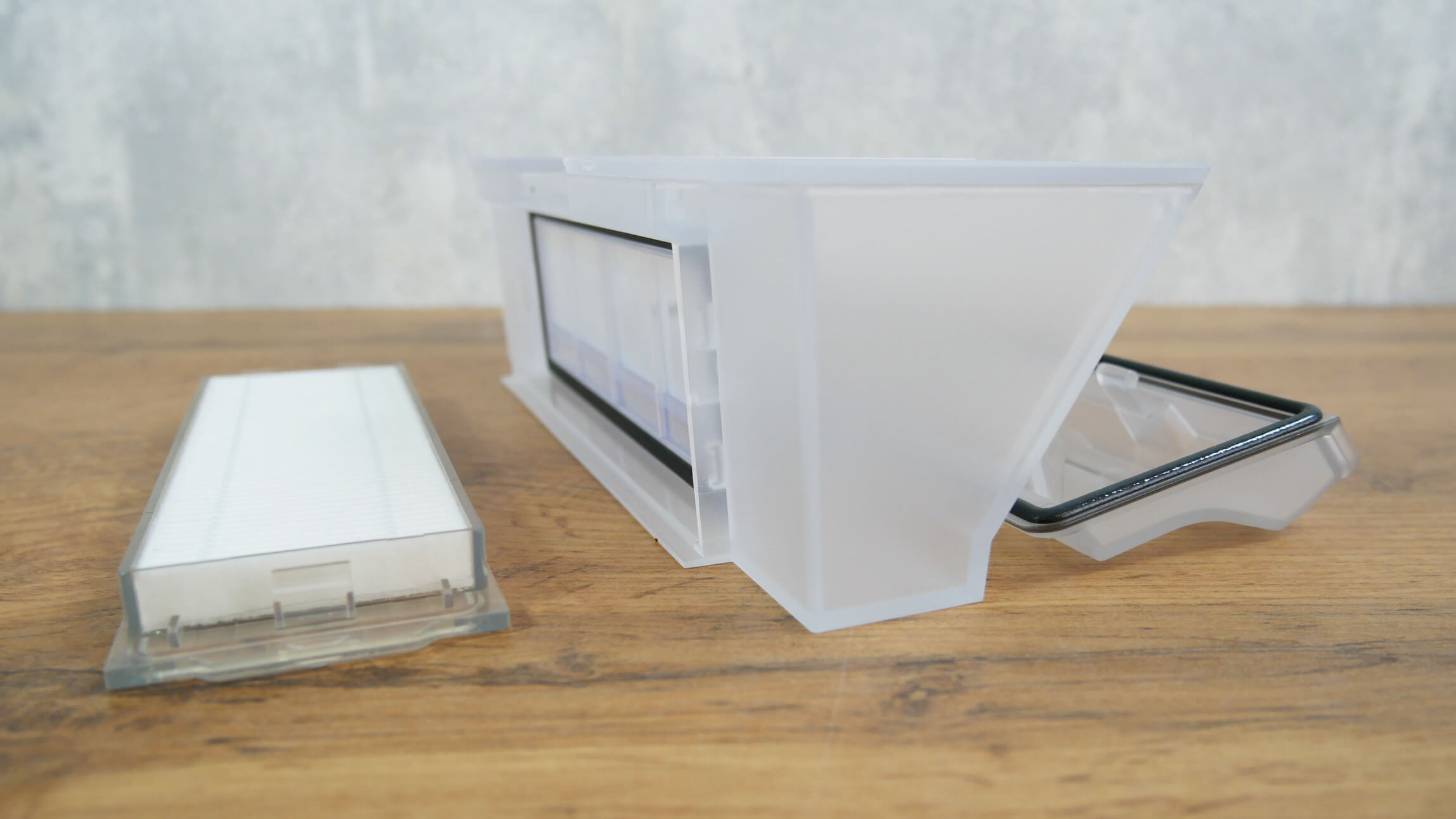 Dulkių surinkimo konteineris yra po viršutiniu dangčiu. Gamintojas leidžia dulkių surinkimo konteinerį plauti vandeniu. Konteineris talpina iki 450 ml sausų atliekų. Filtravimo sistemoje naudojamas tinklelio filtras ir HEPA filtras. Kalbant apie filtrą, nėra konkrečių nurodymų, ar jį galima plauti: tinklelio ar HEPA. Bet kokiu atveju, HEPA filtro geriausia neplauti.