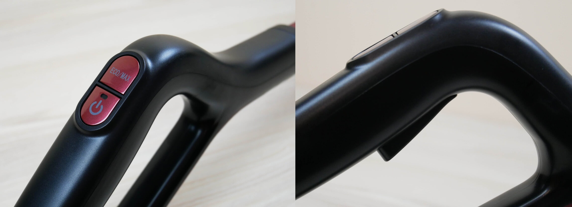 Pagrindiniai valdymo mygtukai yra ant rankenos. Tai įjungimo/išjungimo jungiklis, ECO ir maksimalaus režimų mygtukas bei vandens slėgio mygtukas.
