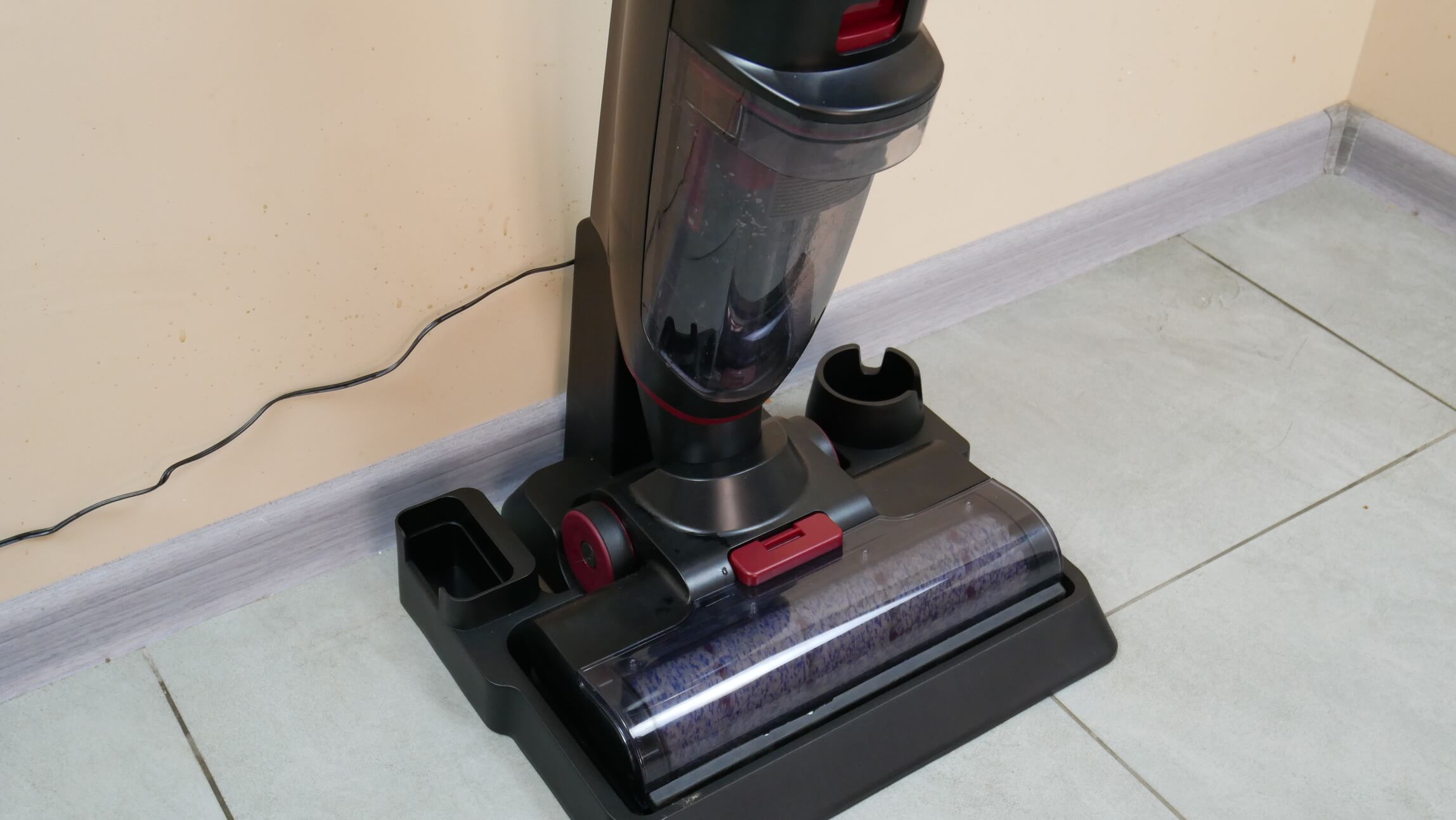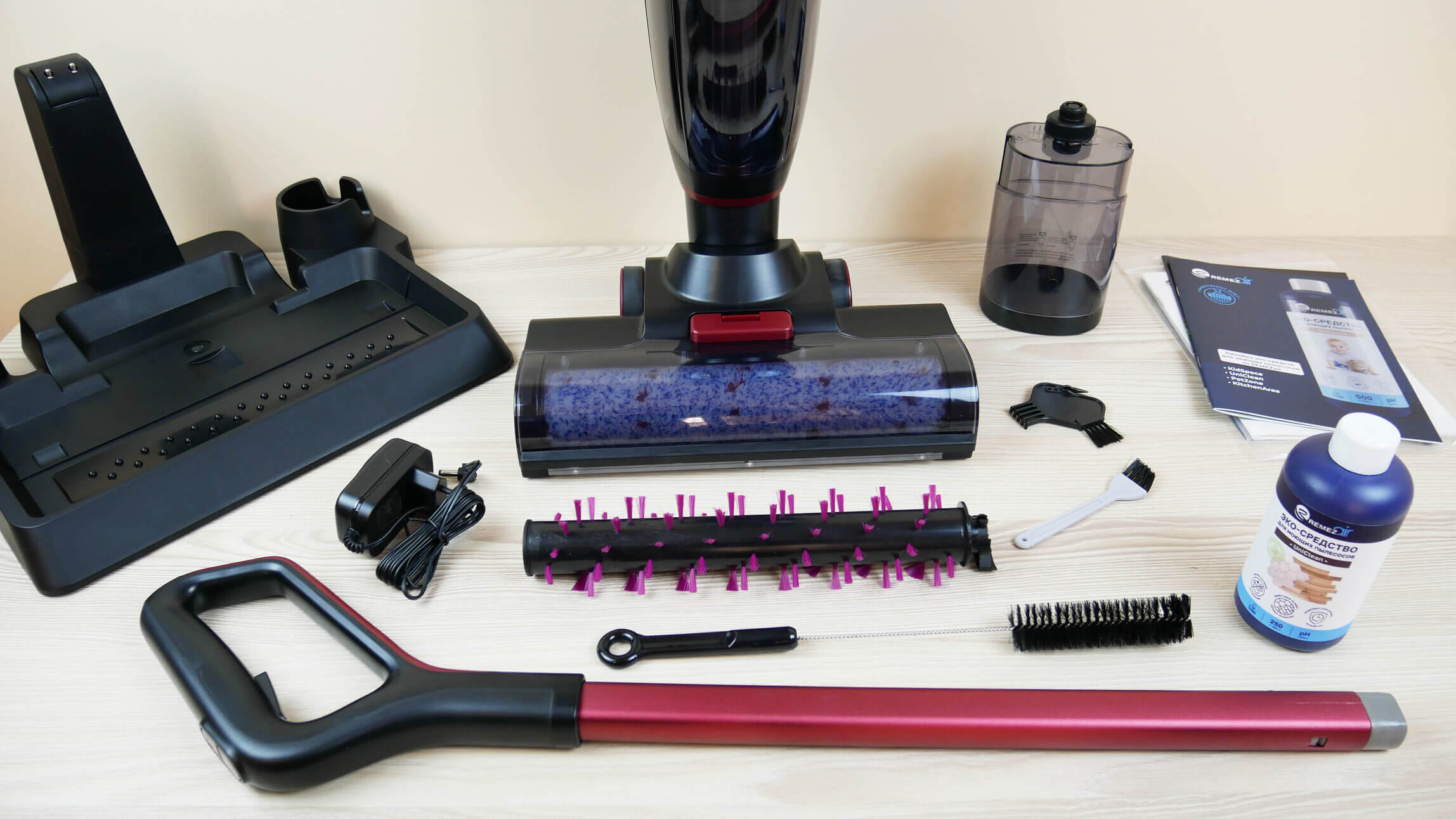 Pažvelkime į „REMEZair RMVC-553 AquaStream PRO“. Pirmiausia jį surinkime, įstatydami vandens baką ir rankeną. Štai kaip atrodo surinktas dulkių siurblys. Verta iš karto pastebėti, kad jį galima pastatyti vertikaliai už įkrovimo stotelės ribų. Spalva neįprasta – raudonos ir juodos derinys – o juoda spalva šlapiam siurbimui yra labai reta. Atidžiau panagrinėkime kiekvieną komponentą.