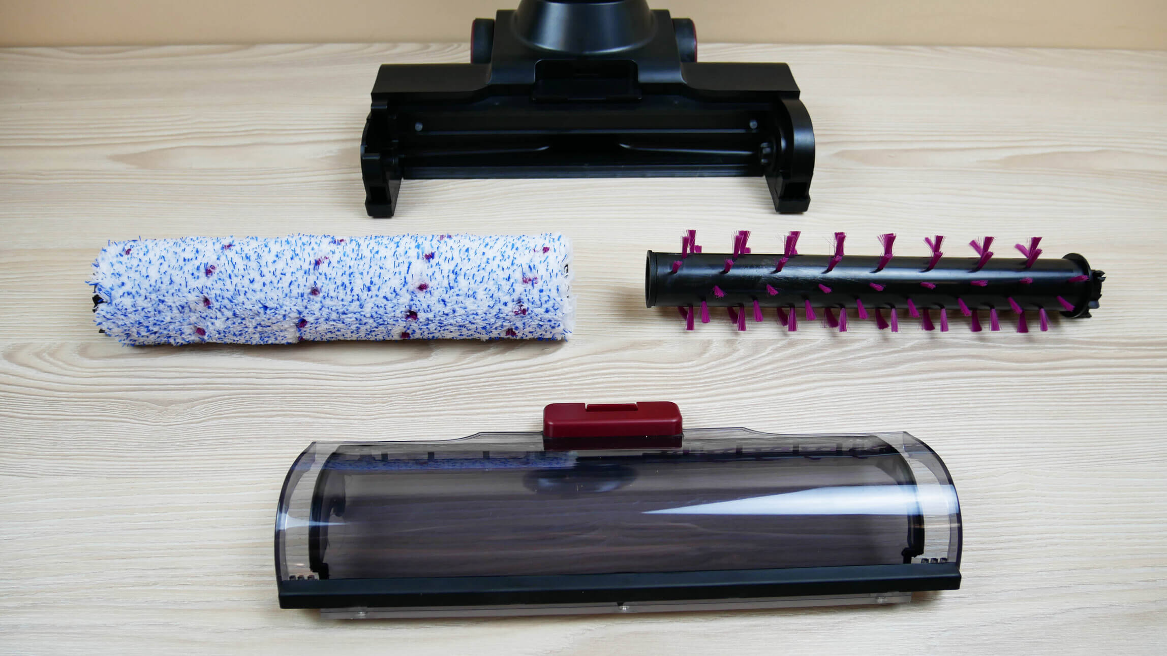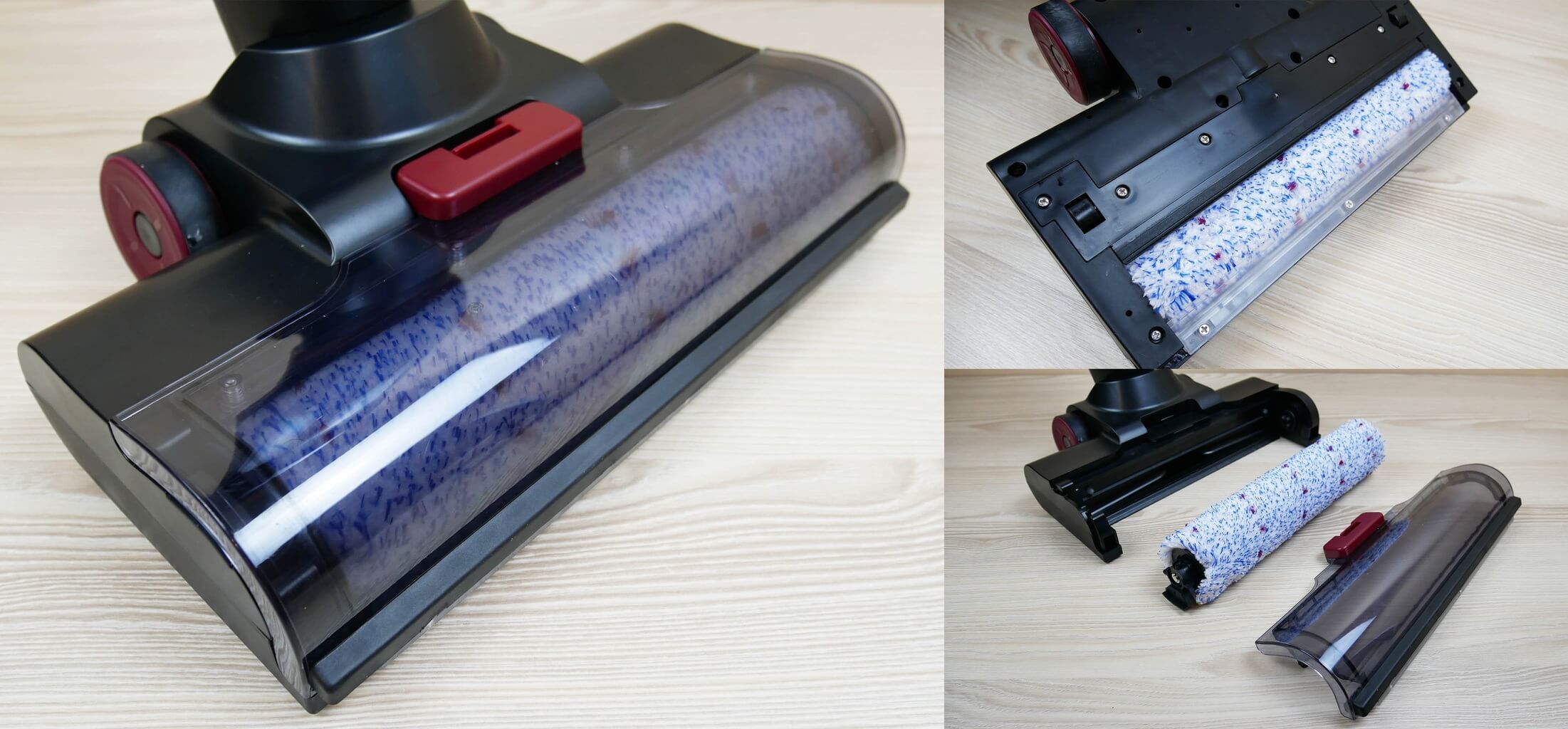 Pradėkime nuo valymo modulio. Purus grindų volelis yra po permatomu, nuimamu dangteliu. Minkšti šereliai yra įmontuoti į minkštus šerelius. Jie skirti efektyviau surinkti plaukus ir kailį nuo grindų.